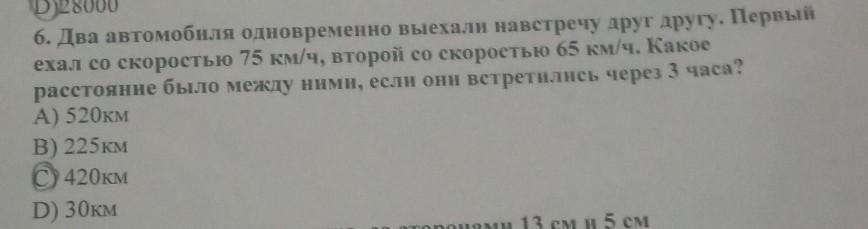 6. Два автомобиля одновременно выехали на ветречу друг другу. Первый ехал со скоростью 75 км/ч, второй со скоростью 6 км/ч. Какое расстояние было между ними, если они встретились через 3 часа? А) 520км B) 225км C) 420км D) 30км