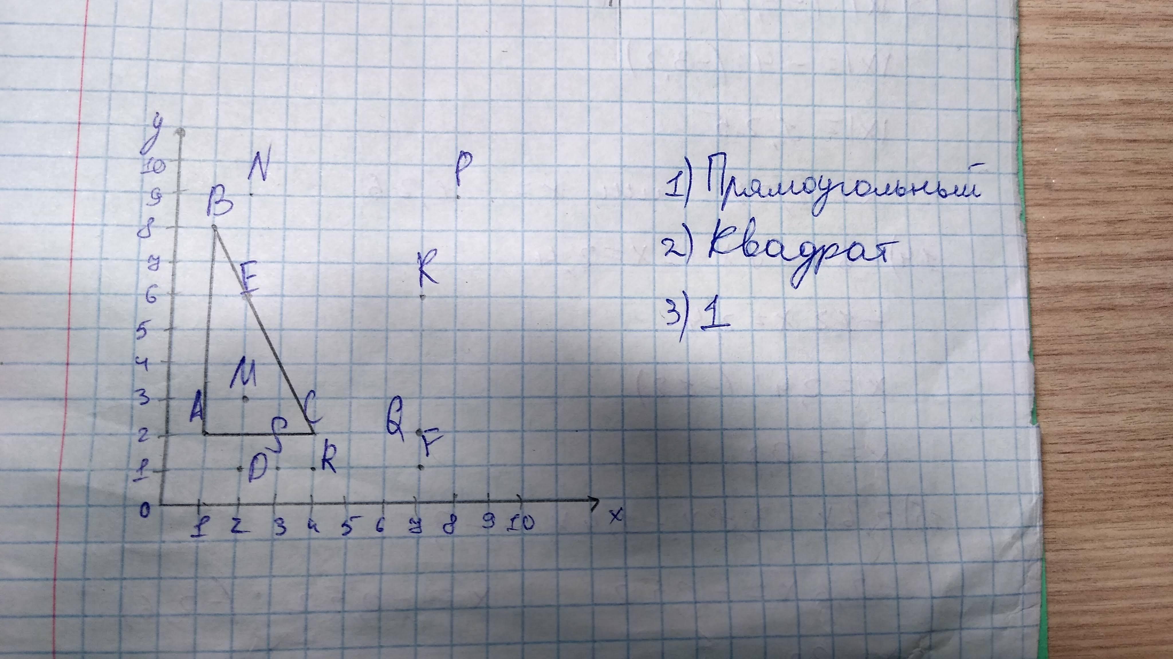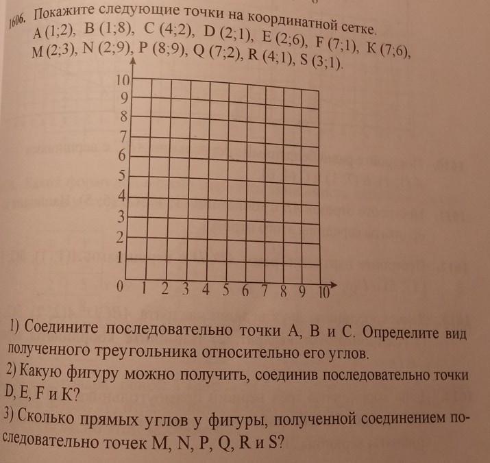 1606. Покажите следующие точки на координатной сетке. А (1;2), В (1;8), C (4;2), D (2;1), Е (2;6), F (7;1), К (7;6), M (2;3), N (2;9), P (8;9), Q (7;2), R (4:1), S (3:1).1) Соедините последовательно точки A, B и C. Определите вид полученного треугольника относительно его углов. 2) Какую фигуру можно получить, соединив последовательно точки D, E, F и К? 3) Сколько прямых углов у фигуры, полученной соединением по- следовательно точек M, N, P, Q, R и S?