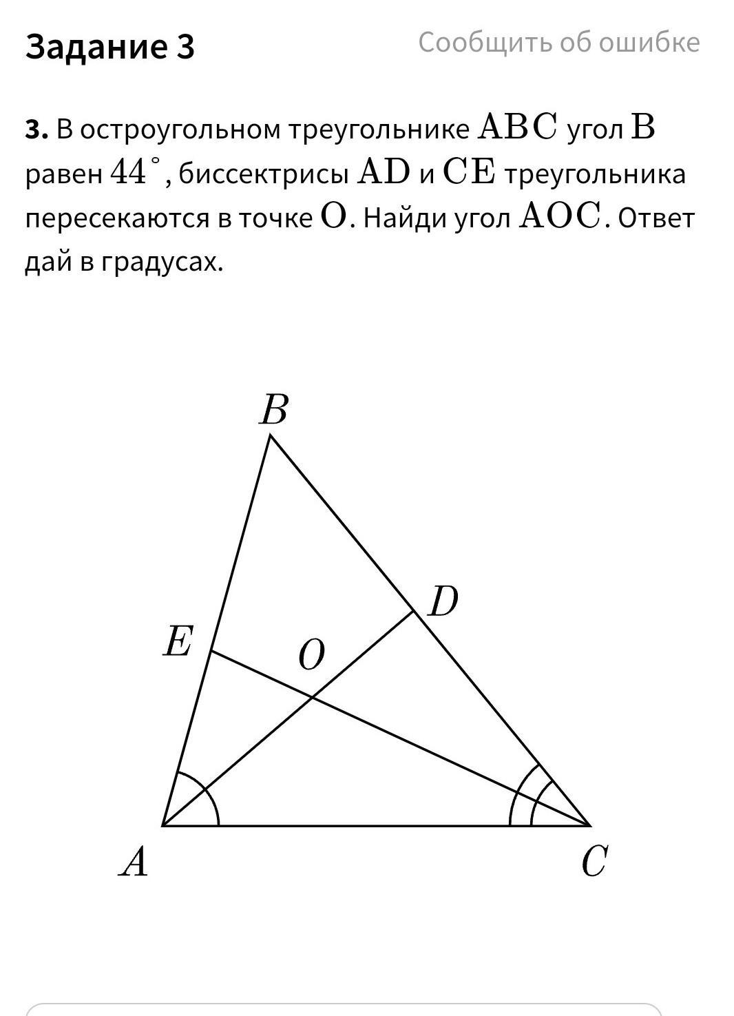 ∠АОС=180°-(∠А/2 + ∠С/2)=180°-(∠А+∠С)/2=180°-(180°-∠В)/2=180°-(180°-44°)/2=180°-68°=112°