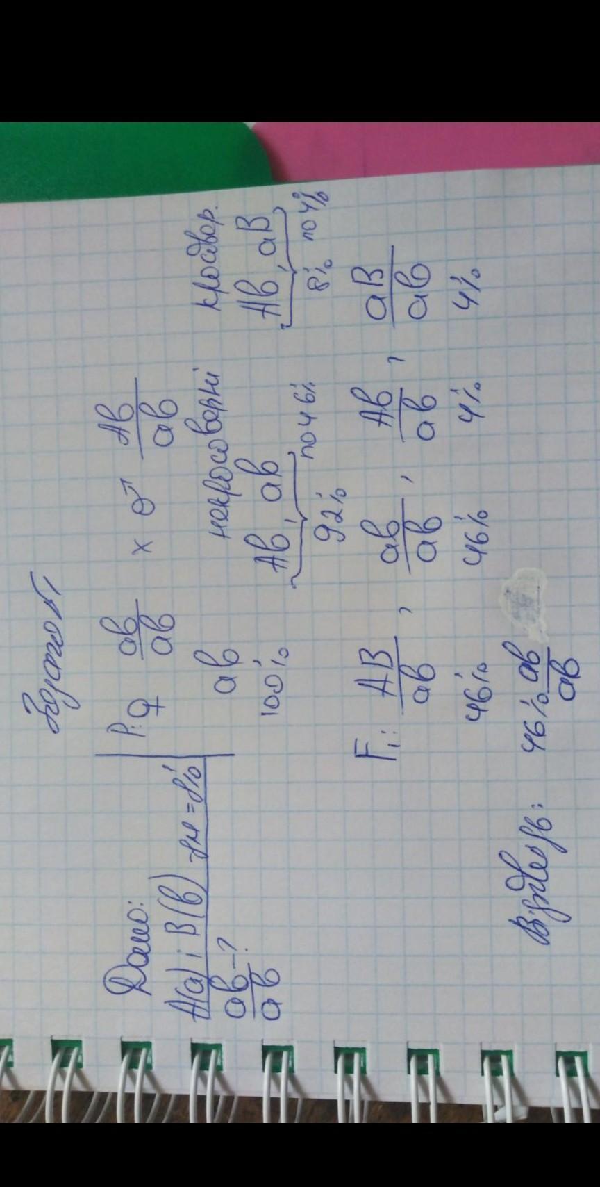 Чоловік отримав від матері хромосому з генами А і В, від батька — з генами а і в, причому ці гени успадковуються зчеплено. Його жінка — рецесивна гомозигота. Яка ймовірність того, що їхня дитина буде рецесивною за обома генами, якщо відстань між генами 8 морганід?