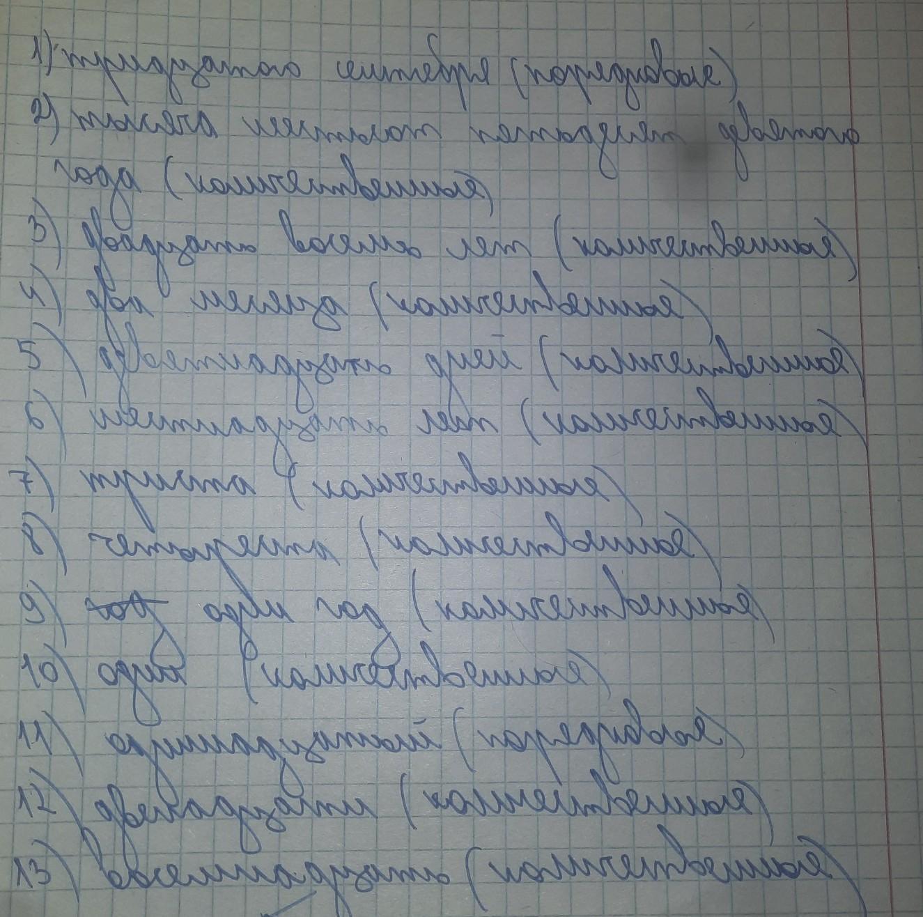 количественные (два, пятьдесят, двести, триста пятьдесят один) и собирательные (оба, двое, пятеро) — отвечают на вопрос сколько?, порядковые — отвечают на вопрос который? (первый, второй, сотый)