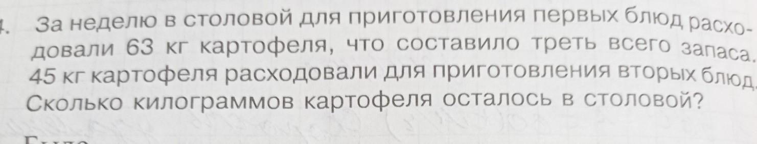 63 кг - треть всего запаса, следовательно, весь запас - 63кг • 3 = 189кг