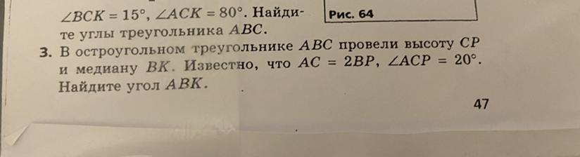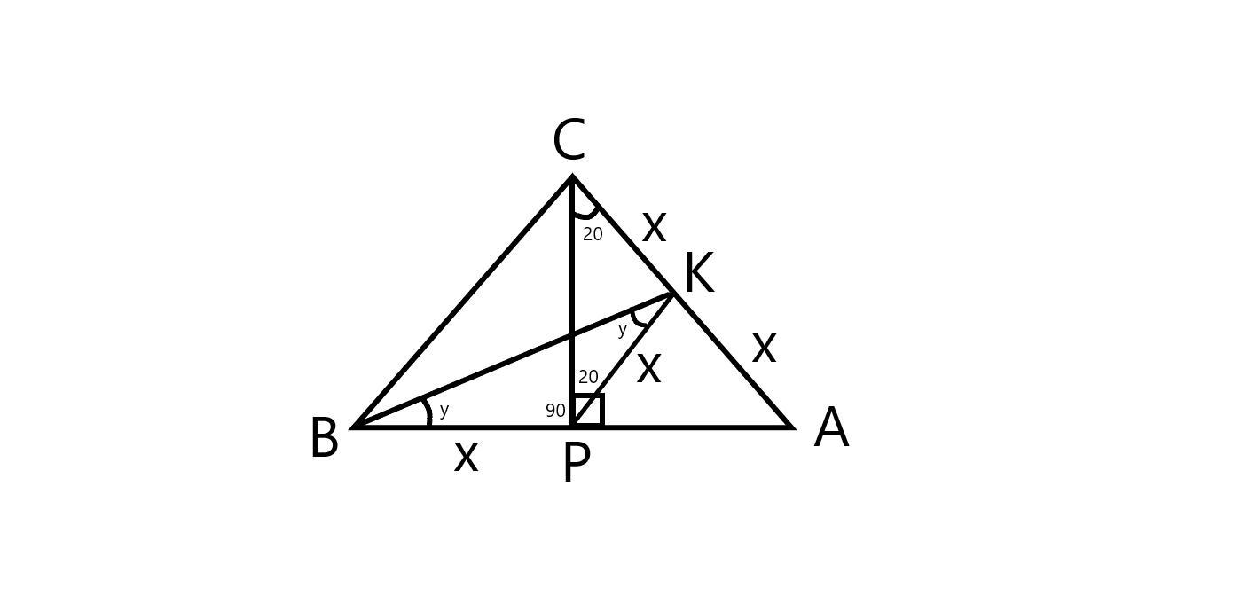 2) По свойству медианы в прямоугольном треугольнике: РК=КС=АК. Получили равнобедренный треугольник СКР, в котором угол КСР=СРК, как углы при основании р/б треугольника. Значит, СРК=20 градусов.