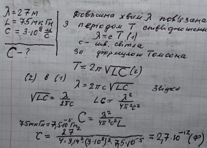 Під час зв’язку з наземними службами передавач літака випромінює радіохвилі на довжині хвилі 27 м . Яка ємність конденсатора антенного контуру передавача, якщо індуктивність цього контуру 75 мкГн?