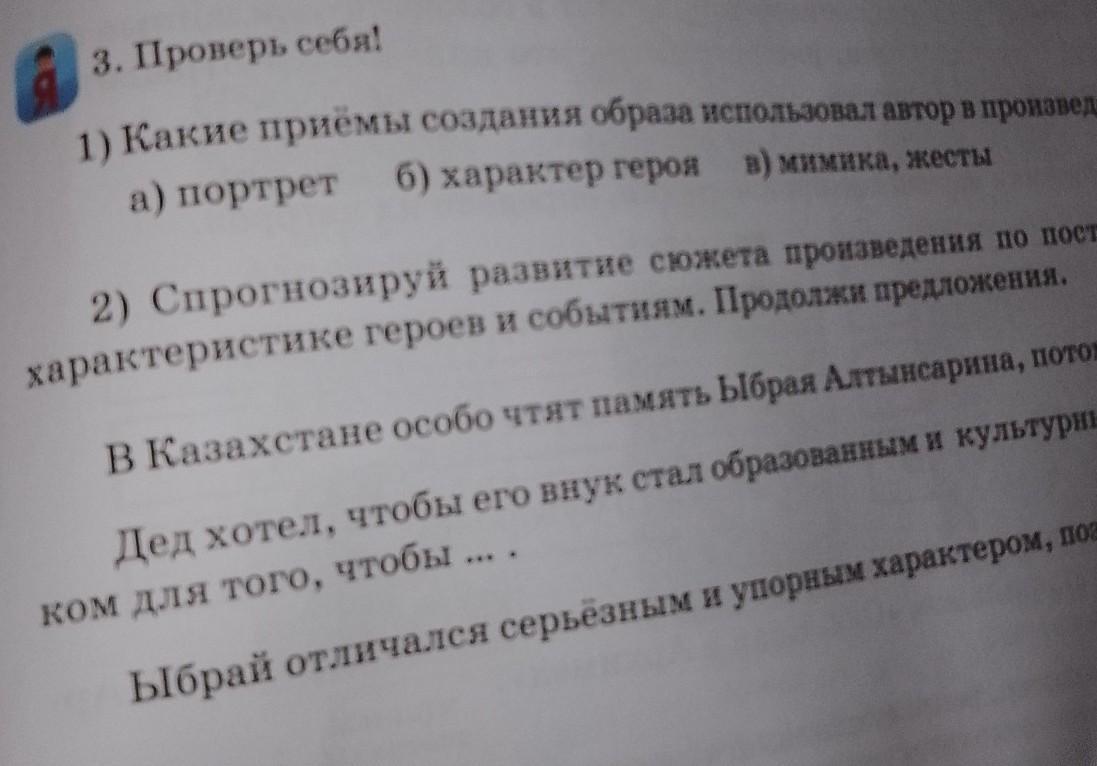3. Проверь себя! Какие приёмы создания образа использовал автор в произведении? в) мимика, жесты б) характер героя а) портрет 2) Спрогнозируй развитие сюжета произведения по поступкам, характеристике героев и событиям. Продолжи предложения, В Казахстане особо чтят память Ыбрай Алтынсарина, потому что.... Дед хотел, чтобы его внук стал образованным и культурным челове- ком для того, чтобы ... Ыбрай отличался серьёзным и упорным характером, поэтому