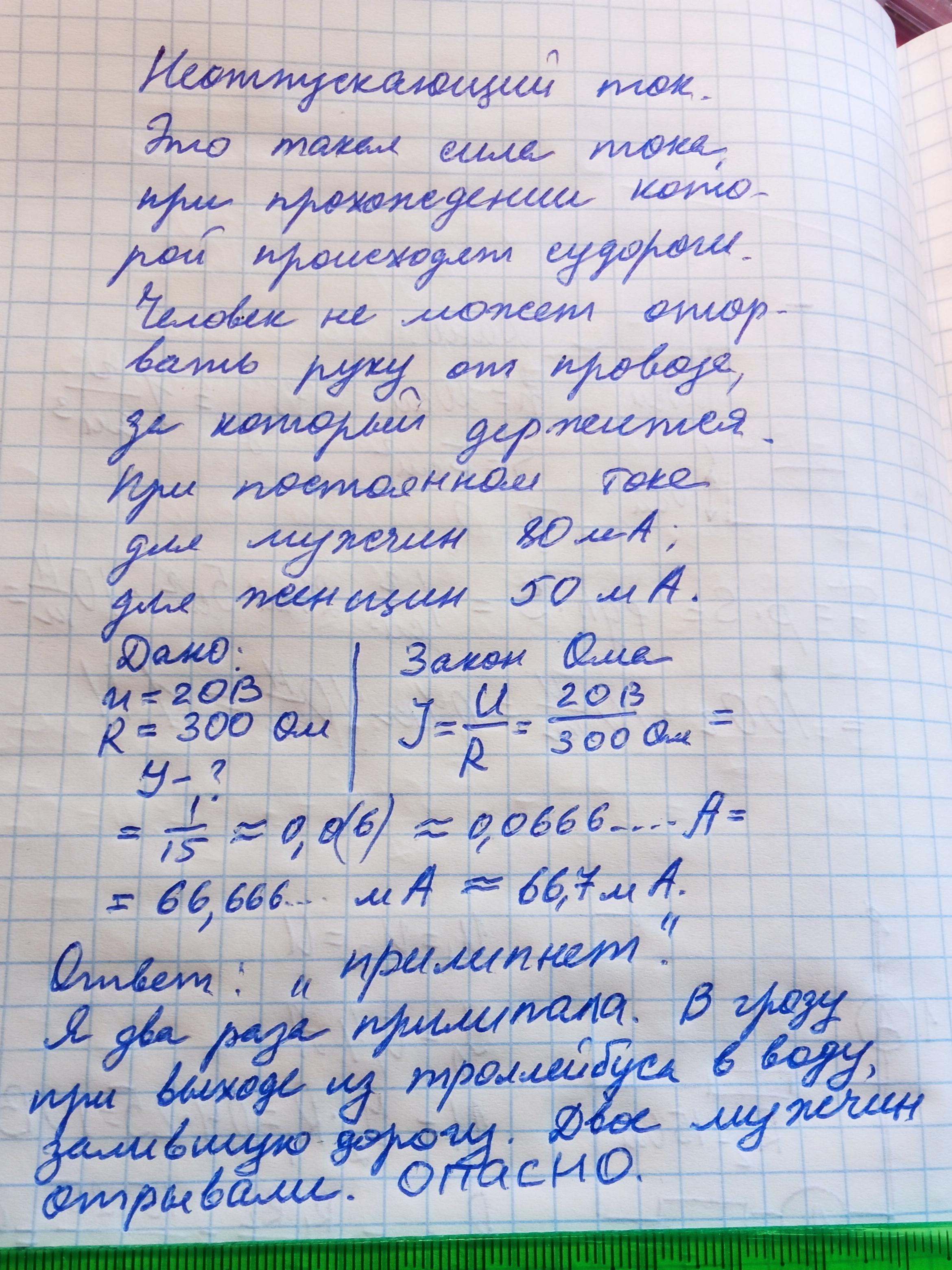 В одной из технологий быстрой зарядки смартфонов используется напряжение 20 В. Оцените опасность зарядки смартфона вблизи воды, вычислив силу тока через тело человека при контакте с зарядным устройством, если сопротивление человека при мокрой коже может достигать значения 300 Ом. При постоянном токе пороговый ощутимый ток равен приблизительно 5–7 мА, пороговый неотпускающий ток – 50–80 мА.