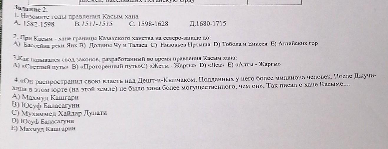 Задание 2. 1. Назовите годы правления Касым хана А. 1582-1598 В.1511-1515 С. 1598-1628 Д.1680-1715 TO TOLNA хане границы Казахского ханства на северо-западе до: Л) Тобола и Енисея Е) Алтайских гор