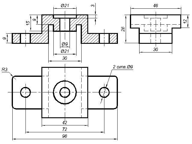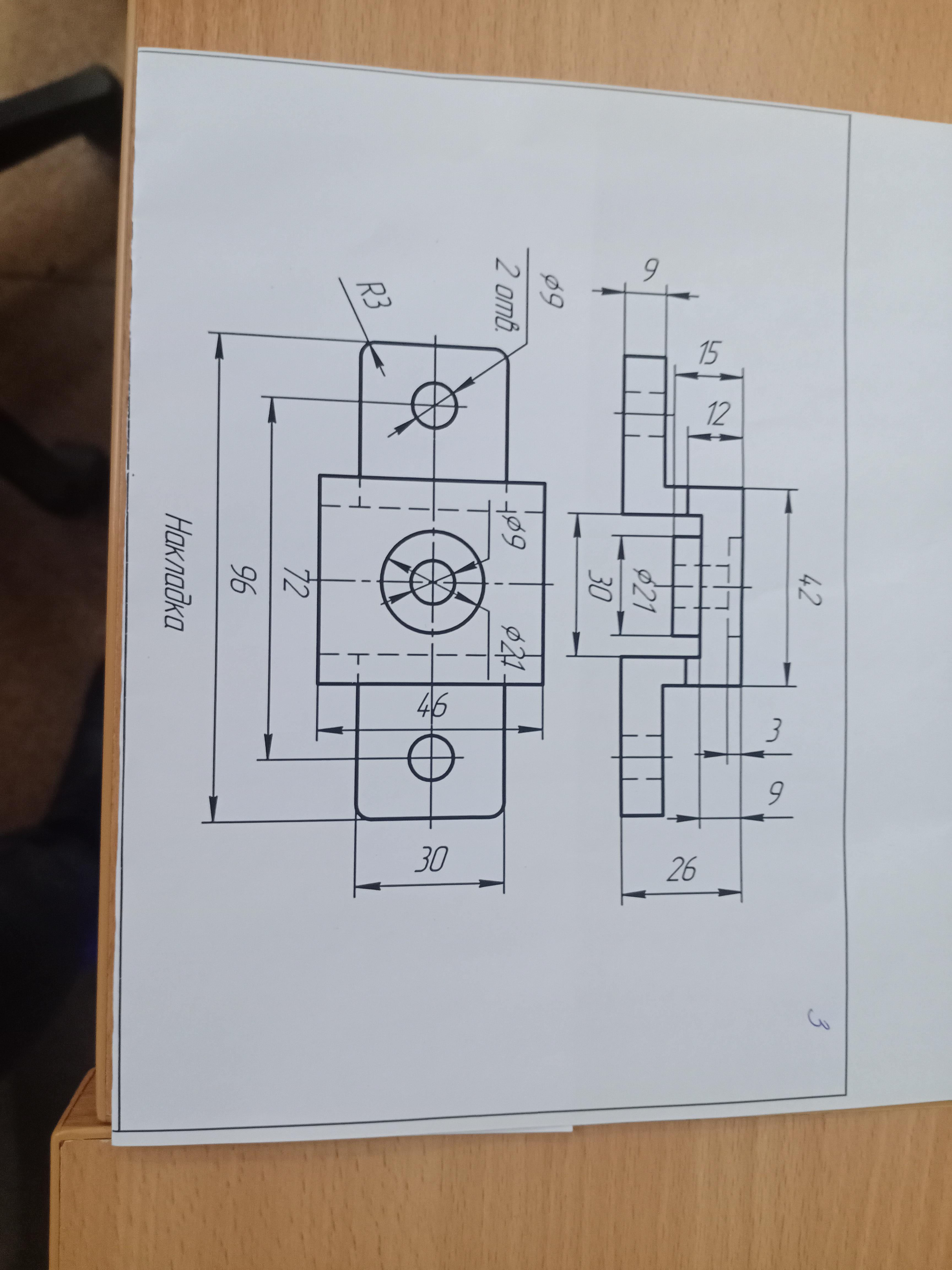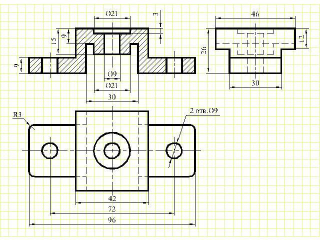 Вид спереди заменила фронтальным разрезом, т.к. размеры не указывают по невидимым (штриховым) линиям.