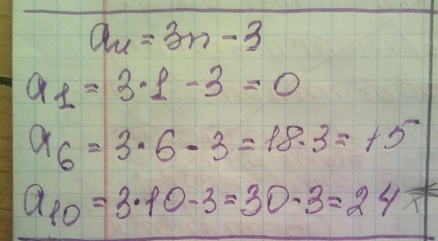 знайди перший, третій, шостий та десятий члени арифметичної прогресії (an), якщо загальна формула аn = 3n - 3