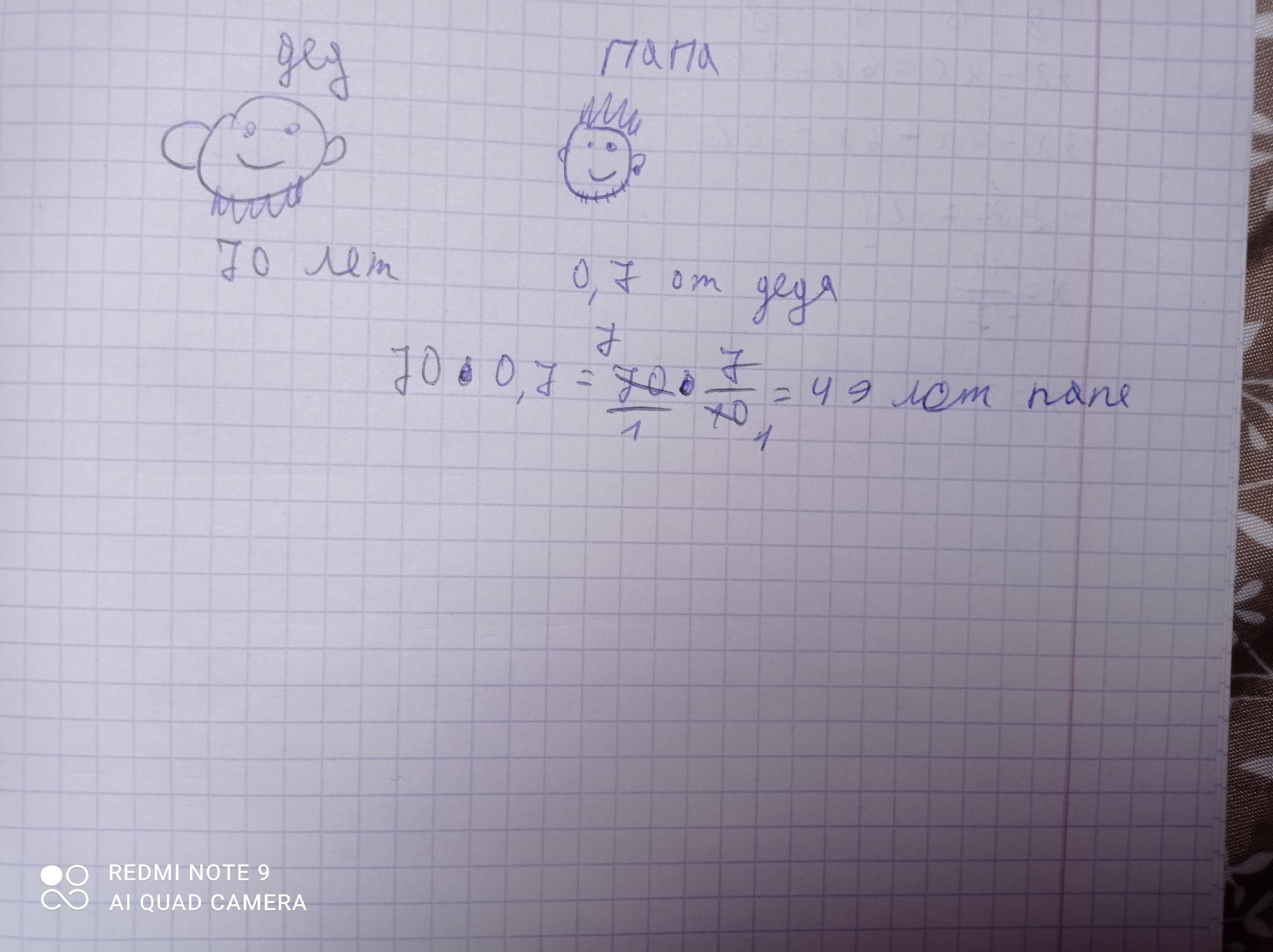 Дедушке 70 лет, возраст папы 0,7 возраста дедушки. Насколько лет дедушка старше папы? Записать в виде десятичной дроби.