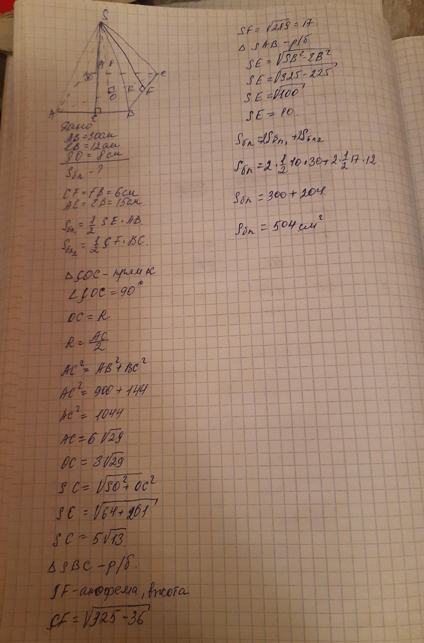 Основание пирамиды является прямоугольник со сторонами 12 и 30 см и высотой 8 см, боковые рёбра образуют с плоскостью основания равные углы. Найти Sбок.поверхности.