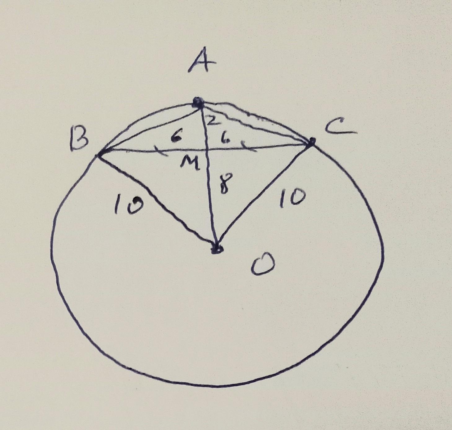 Отсюда ОМ = √(ОВ²-ВМ²) = √(100-36) = 8