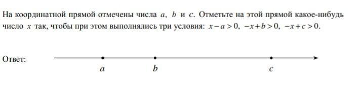 на координатной прямой отмечены числа а, б и с. отметьте на этой прямой какое нибудь число х так, чтобы при этом выполнялись условия х - а>0, -х + б >0 - х + с >0