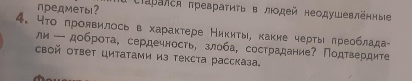 В характере Никиты проявились доброта, чуткость, желание очеловечить все вокруг: "Никита пошел далее во двор и пришел в сарай, где стояла в темноте пустая бочка. В ней, наверно, кто-нибудь жил, какой-нибудь маленький человек; днем он спал, а ночью выходил наружу и ел хлеб, пил воду и думал что-нибудь, а наутро опять прятался в бочку и спал". Кроме того, мальчишка был любознательным: "Никита наклонился через сруб колодца и спросил: - Вы чего там? Он думал, что там живут на дне маленькие водяные люди".