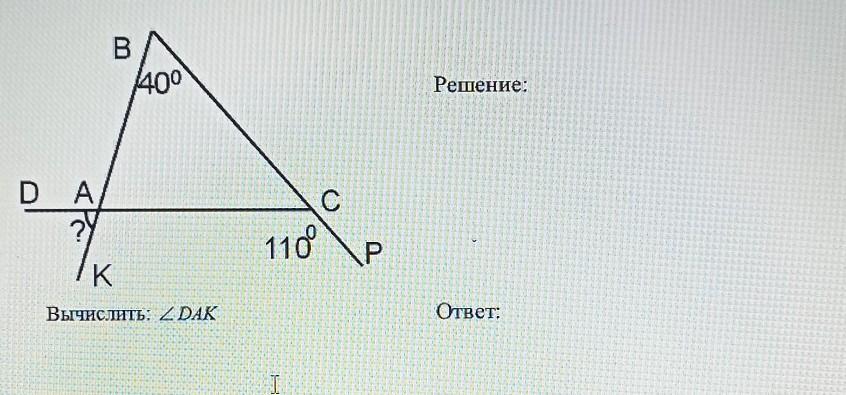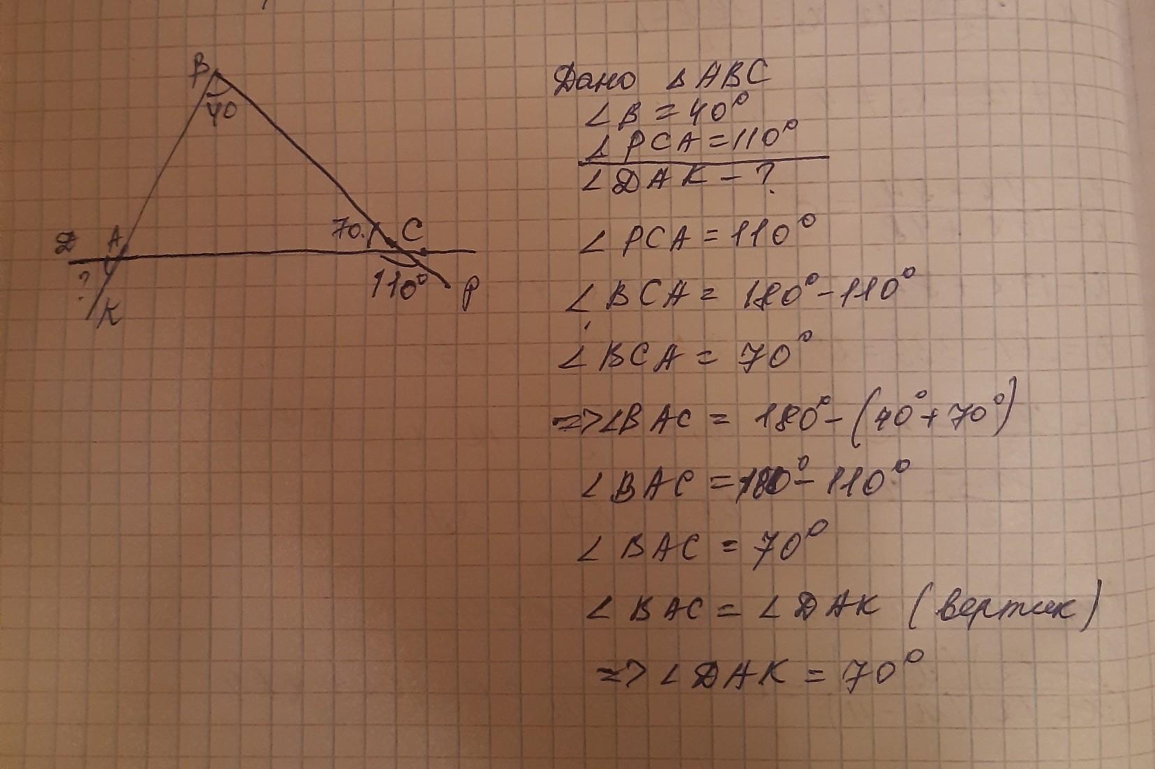 Значит, Угол ВАС = Угол АСР - Угол АВС = 110 - 40 = 70 градусов