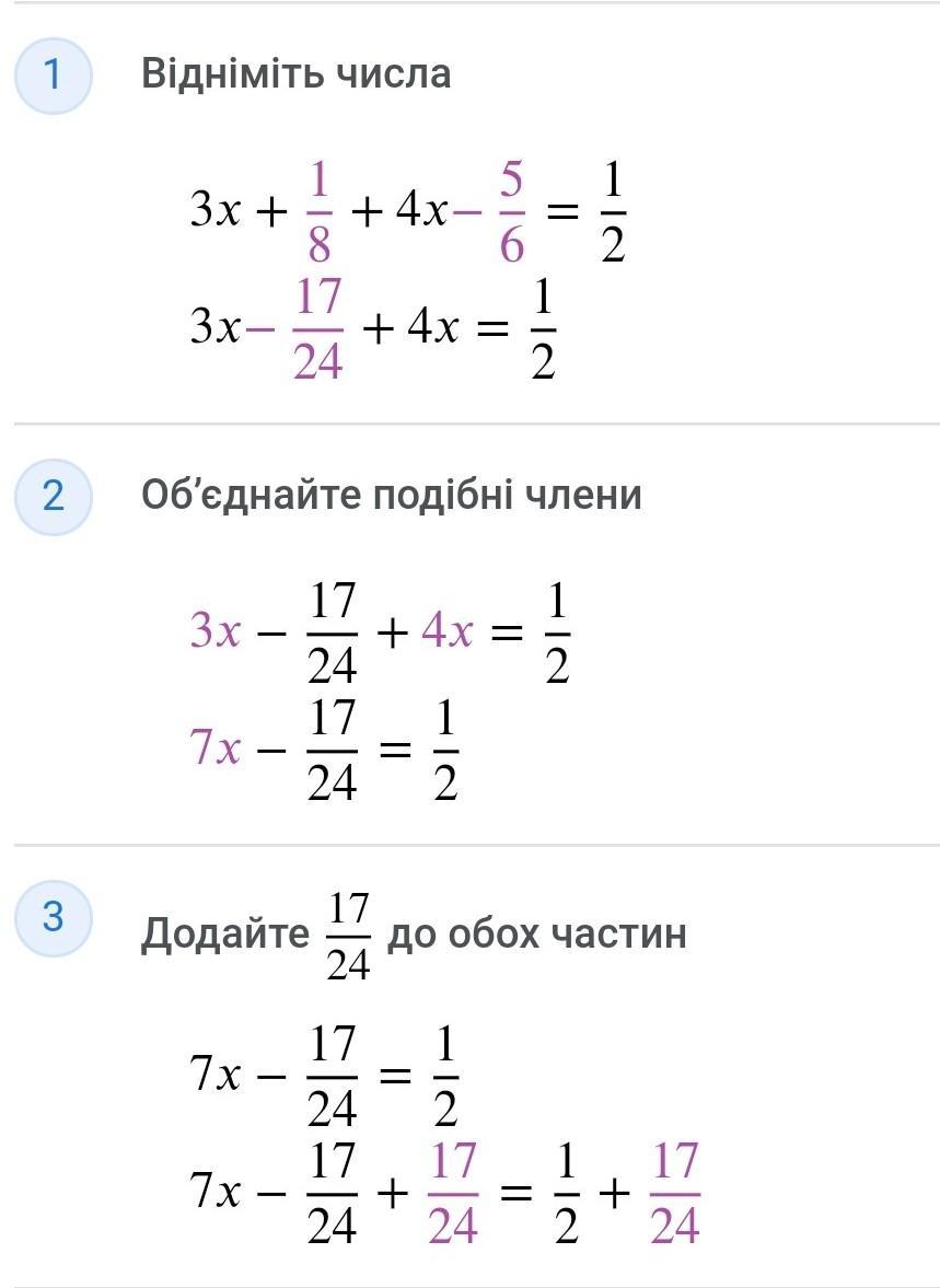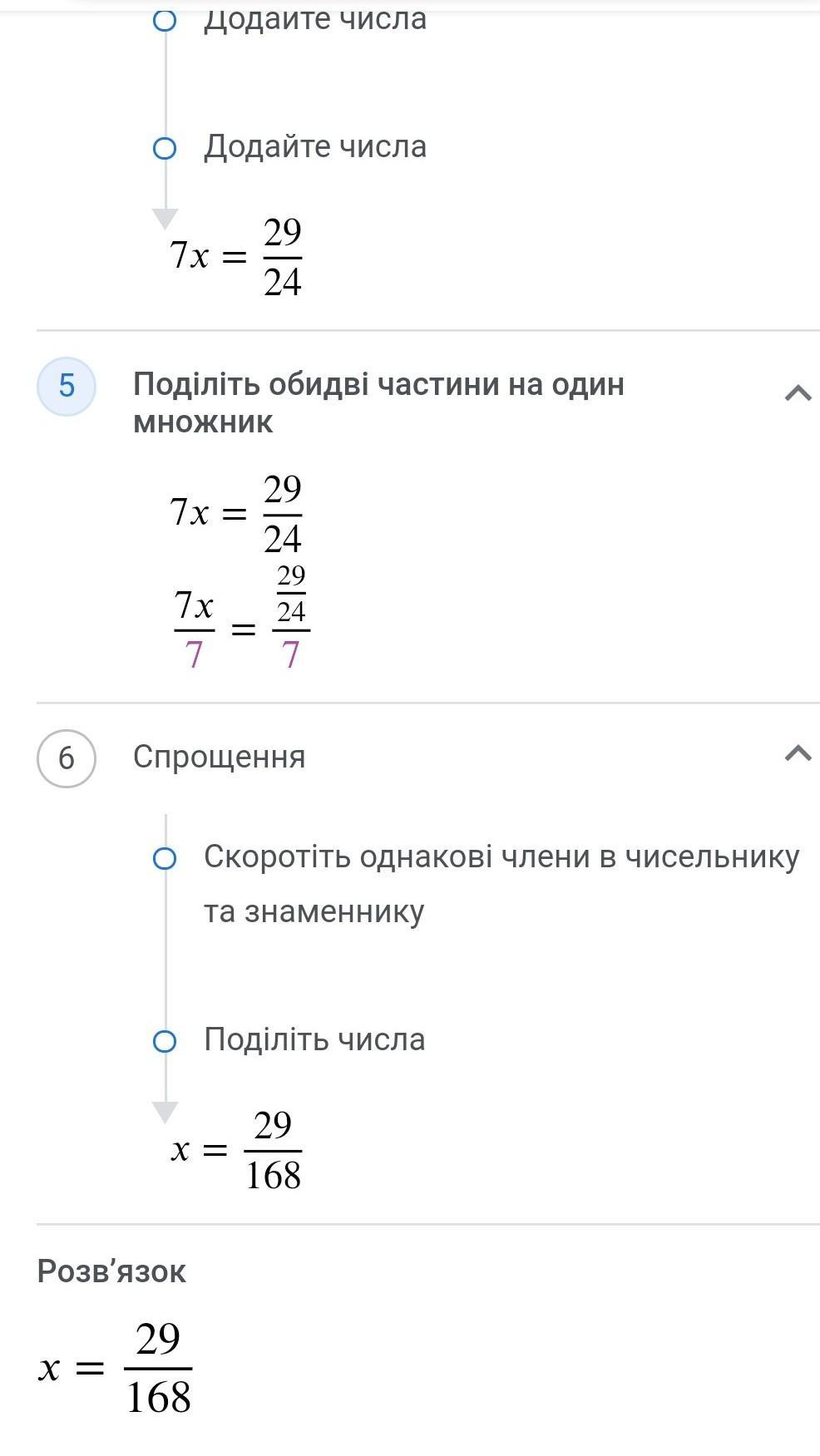 3x+1/8+4x-5/6=1/2 ответ x=29/168