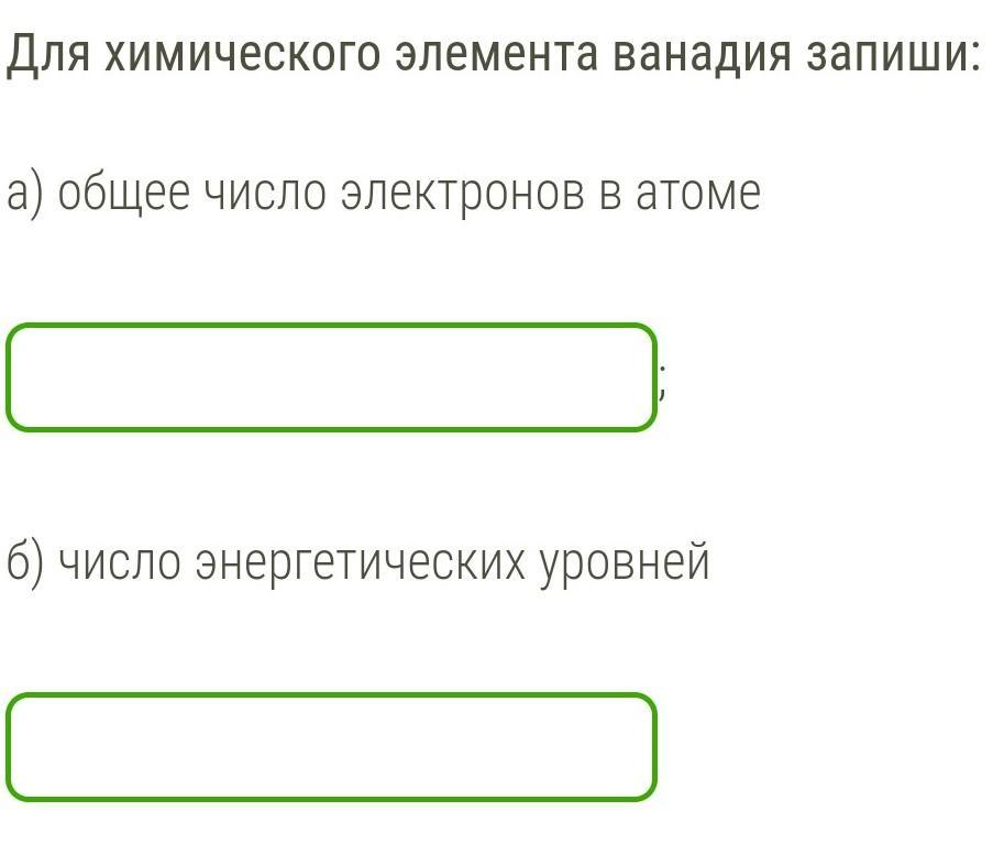 Для химического элемента ванадия запиши: а) общее число электронов в атоме б) число энергетических уровней