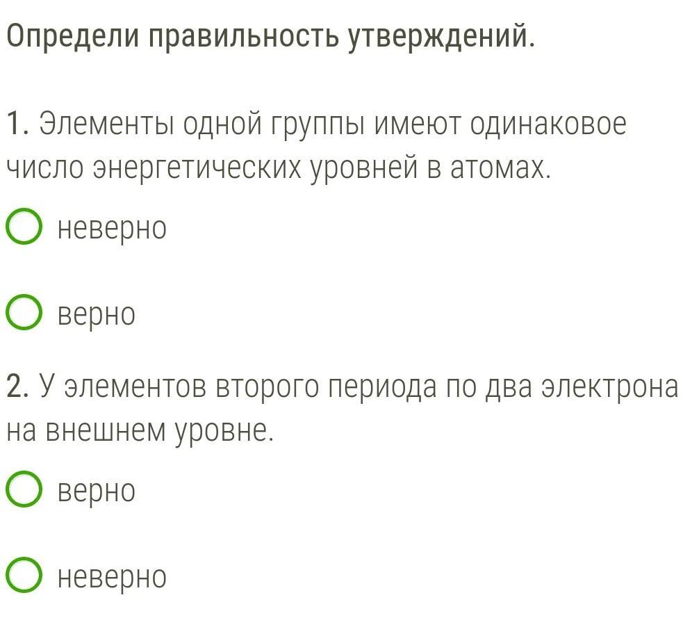 Определи правильность утверждений. 1. Элементы одной группы имеют одинаковое число энергетических уровней в атомах. неверно Оверно 2. У элементов второго периода по два электрона на внешнем уровне. верно неверно