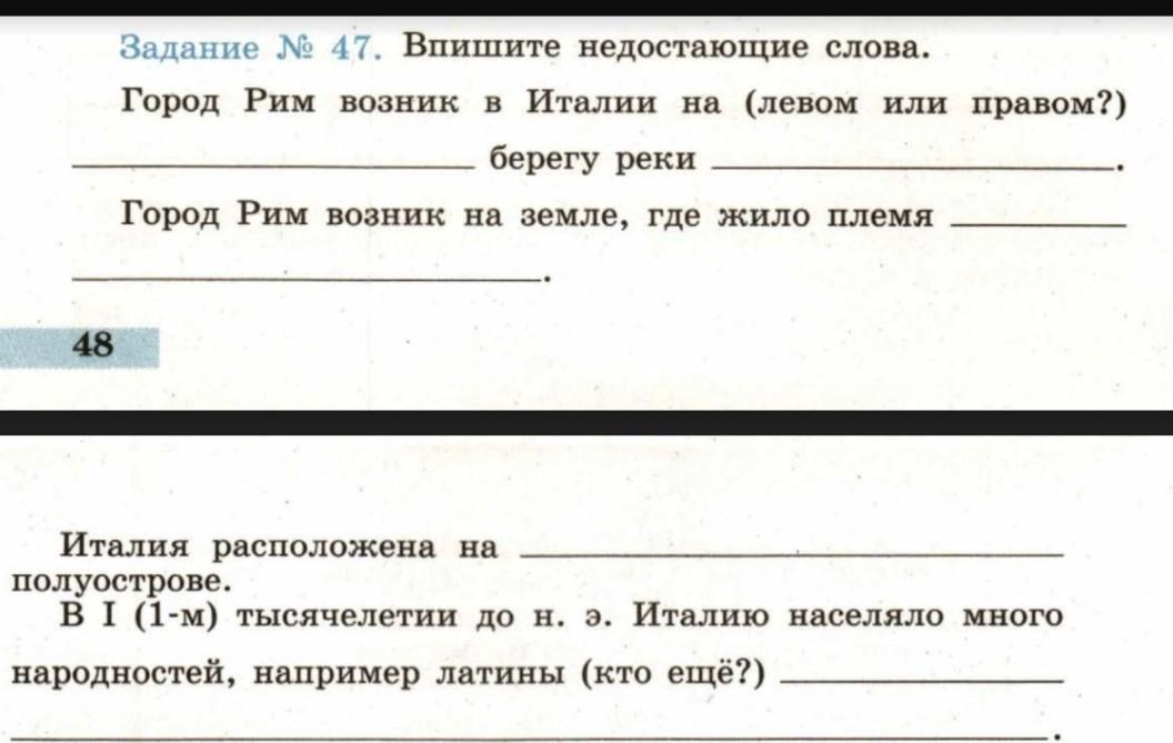 Город Рим возник в Италии на левом берегу реки Тибр. Город Рим возник на земле племени латинов. Италия расположена на Апеннинском полуострове. В 1-м тысячелетии до н.э. Италию населяло много народностей, например латины, этруски, галлы, умбры, самниты, апулы.