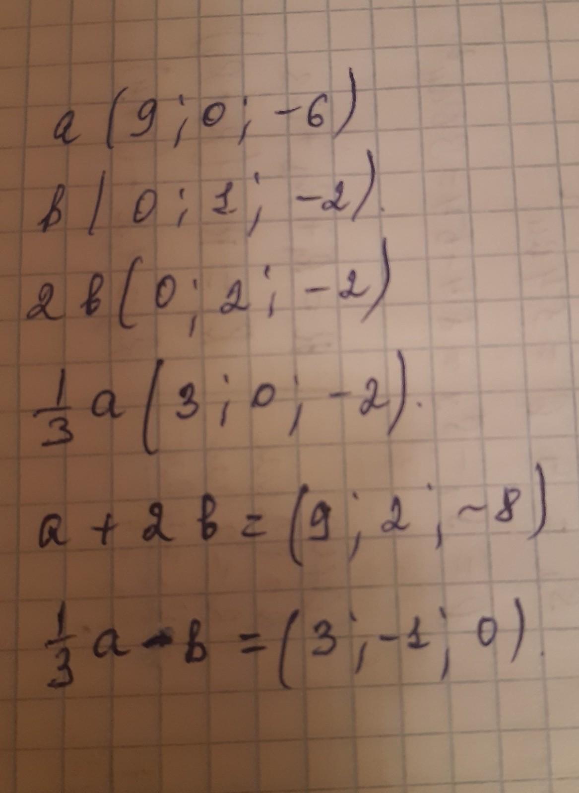 1. Задано вектори а (9; 0; -6) ib (0; 1; -2). Знайдіть ко- ординати вектора: 2) а+ 2b. 1)1/3a-b