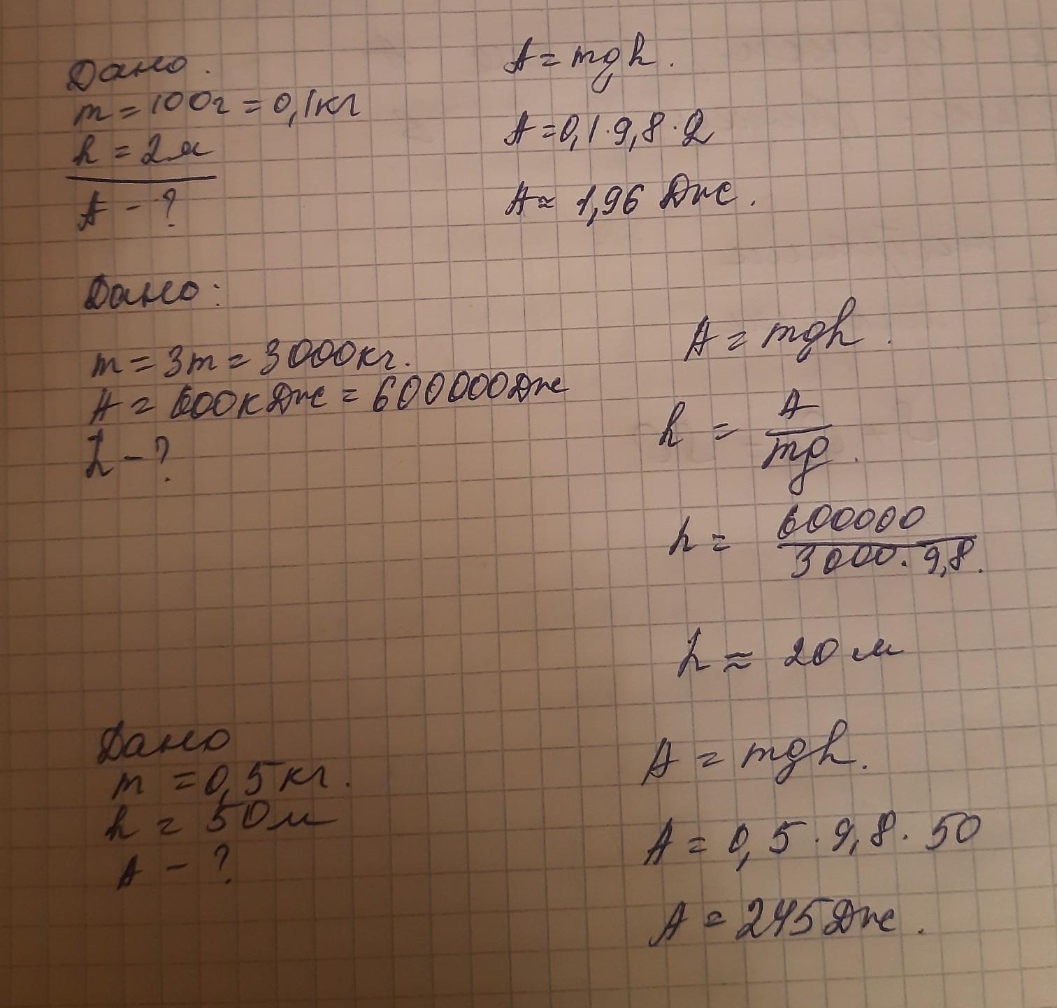 1. Какую работу совершает мальчик, подбросив мяч массой 100г на высоту 2 метра? 2.При падении воды массой 3т совершается работа 600кДж. С какой высоты падает вода? 3. Птица, масса которой 0,5 кг поднята воздушным потоком на высоту 50м. Определите работу силы, поднявшей птицу.