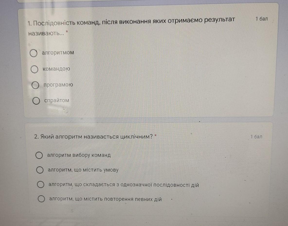 1)Алгоритм 2)Алгоритм що містить повторення певних дій
