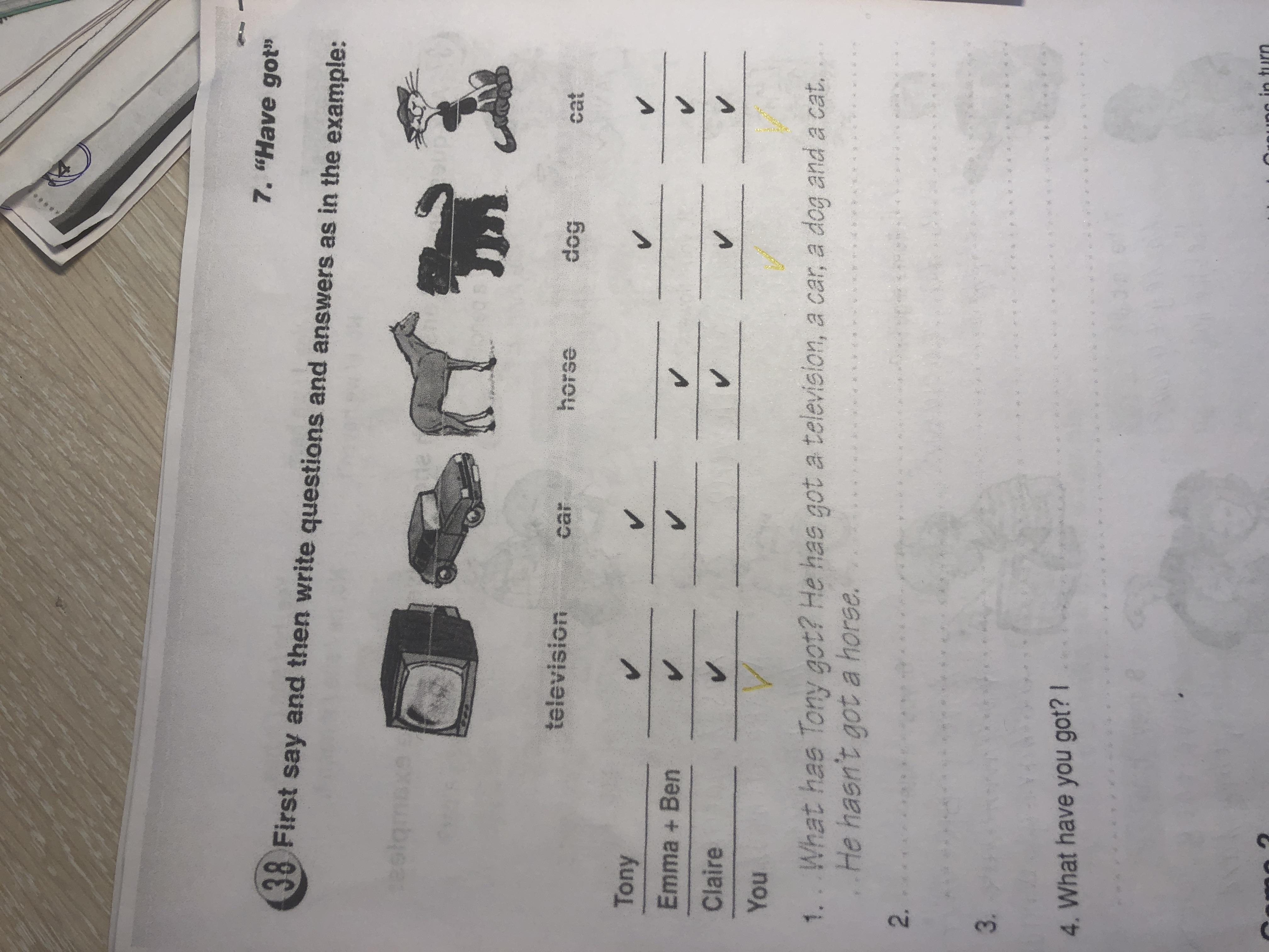 1) what have emma and ben got? they have a television, a car, a horse and a cat