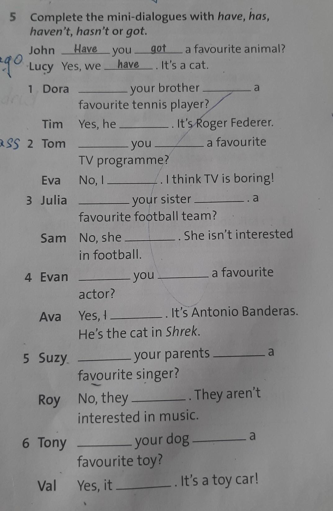 Have you a Complete the mini-dialogues with have, has, haven't, hasn't or got. John got a favourite animal? O Lucy Yes, we have . It's a cat. 1. Dora your brother favourite tennis player? Tim Yes, he It's Roger Federer. S 2 Tom a favourite TV programme? Eva No, I . I think TV is boring! 3 Julia ..a favourite football team? Sam No, she She isn't interested in football 4 Evan you a favourite actor? you your sister Ava Yes, -. It's Antonio Banderas. He's the cat in Shrek. a 5 Suzy your parents favourite singer? Roy No, they They aren't interested in music. 6 Tony favourite toy? Val Yes, it It's a toy car! your dog
