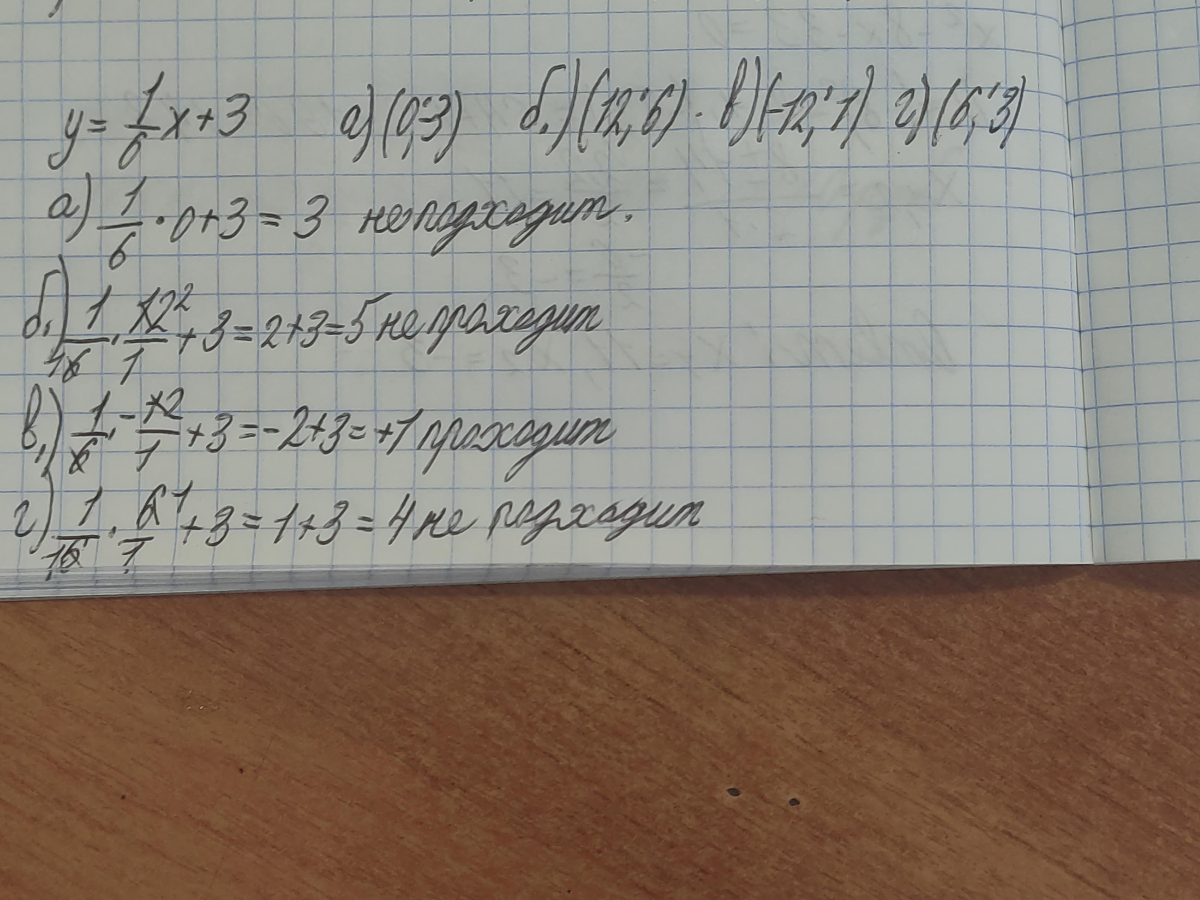 Не виконуючи побудови графіка функції у = 1/6х+3 з'ясувати, чи проходить цей графік через точку: а) (0; - 3); б) (12; 6); в) (- 12; 1); Г) (6; 3).
