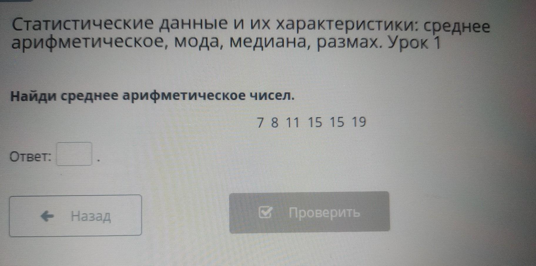 Статистические данные и их характеристики: среднее арифметическое, мода, медиана, размах. Урок 1 Найди среднее арифметическое чисел. 7 8 11 15 15 19 Ответ: