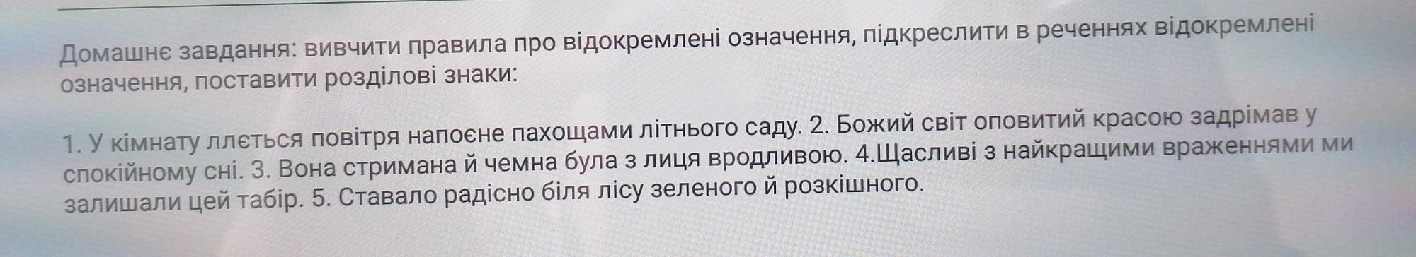 1.У кімнату ллється повітря,напоєне похощами літнього саду.2.Божий світ оповитий красою,задрімав у спокойному сні.3.Вона стримана й чемна,була з лиця вродливою.4.Щасливі, з найкращими враженнями, ми залишали цей табір.5.Ставало радісно,біля лісу зеленого й розкішного.