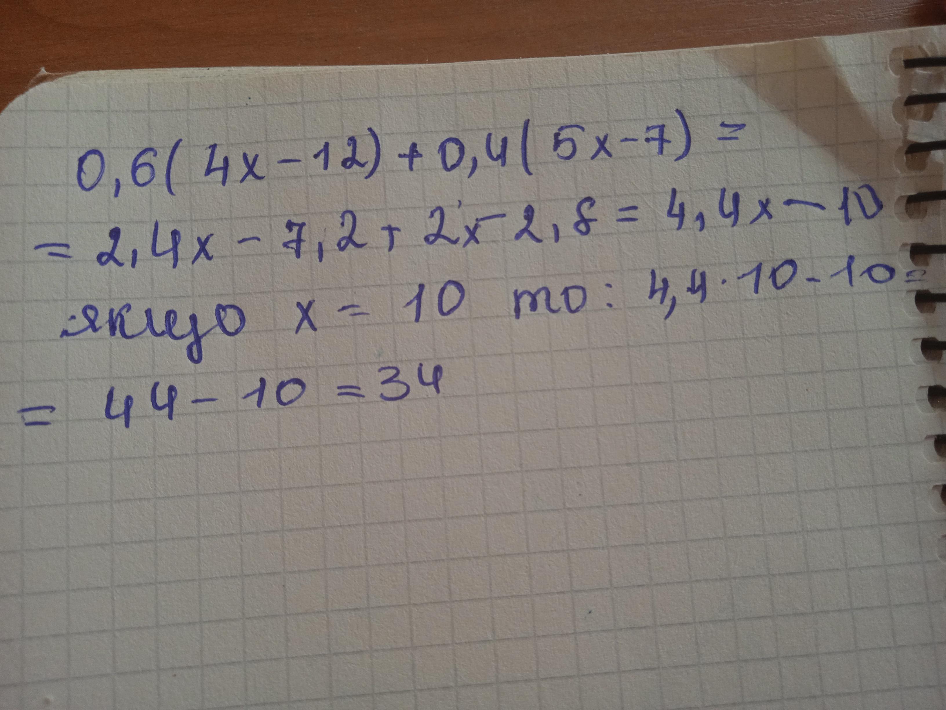 0,6(4х-12)+0,4(5х-7)=2,4х-7,2+2х-2,8=4,4х-10