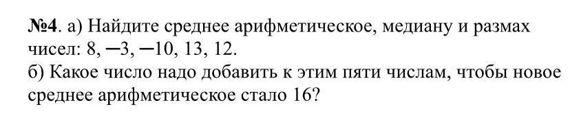 а) Найдите среднее арифметическое, медиану и размах чисел: 8, -3, -10, 13, 12