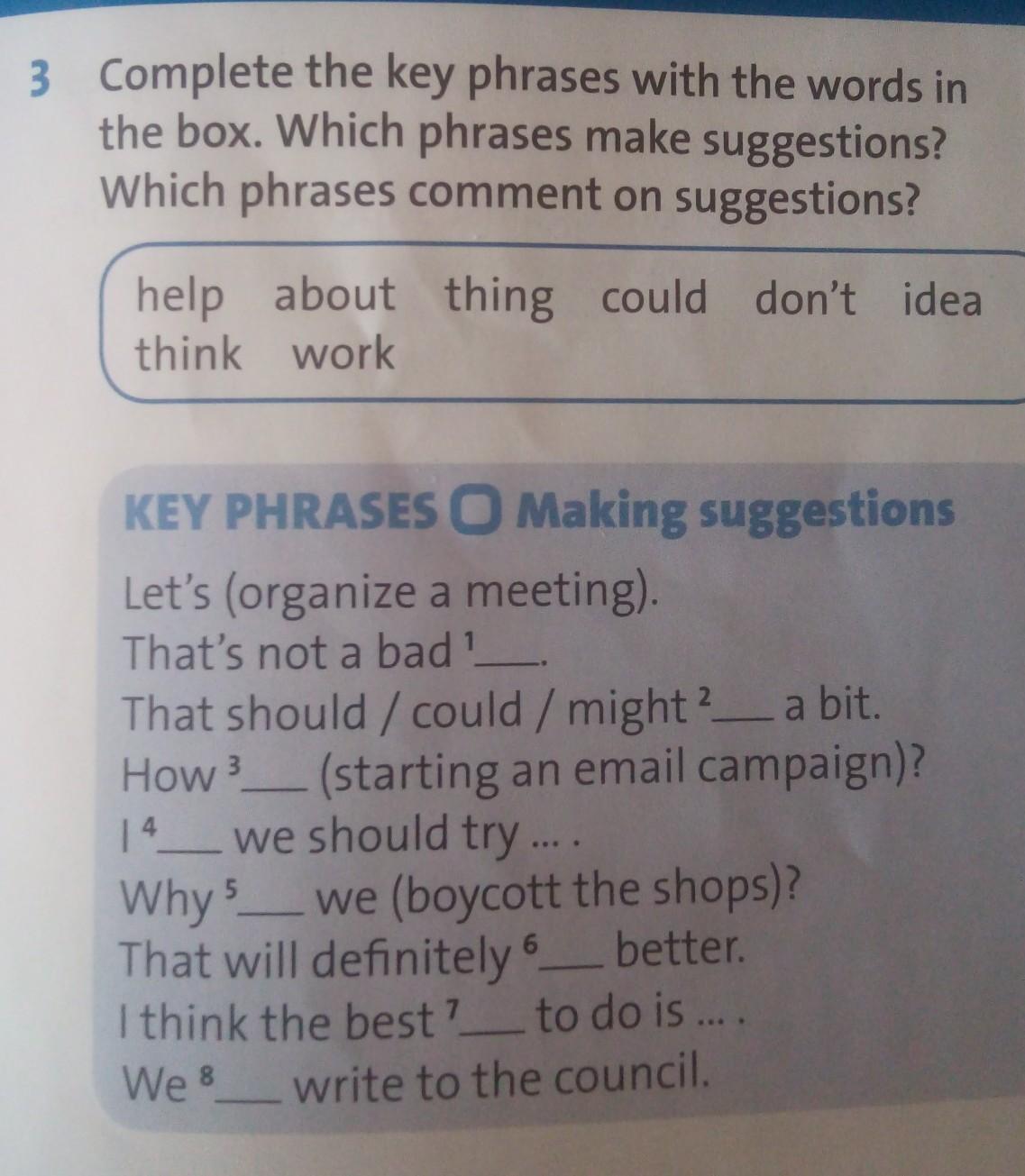 3 Complete the key phrases with the words in the box. Which phrases make suggestions? Which phrases comment on suggestions? help about thing could don't idea think work KEY PHRASES O Making suggestions Let's (organize a meeting). That's not a bad'_. That should / could / might?__a bit. How?__ (starting an email campaign)? 14 we should try .... Whys_we (boycott the shops)? That will definitely 6_better think the best to do is ... We 8 write to the council.