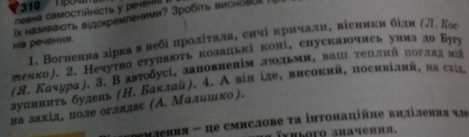 1. Вогненна (означення, прикметник) зірка (підмет, іменник) в небі (обставина, прислівник) пролітала (присудок, дієслово), сичі (підмет, іменник) кричали (присудок, дієслово), вісники біди (це все додаток, іменники).