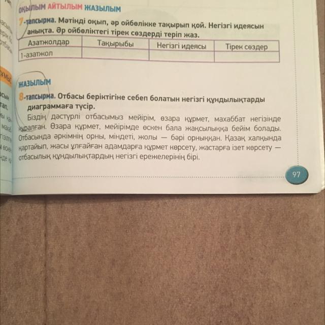 өзара құрмет,махаббат негізінде құрылған,отбасында әр кім нің орны,міндет,жасы ұлғайған адамдарға құрмет көрсету,жастарға ізет көрсету