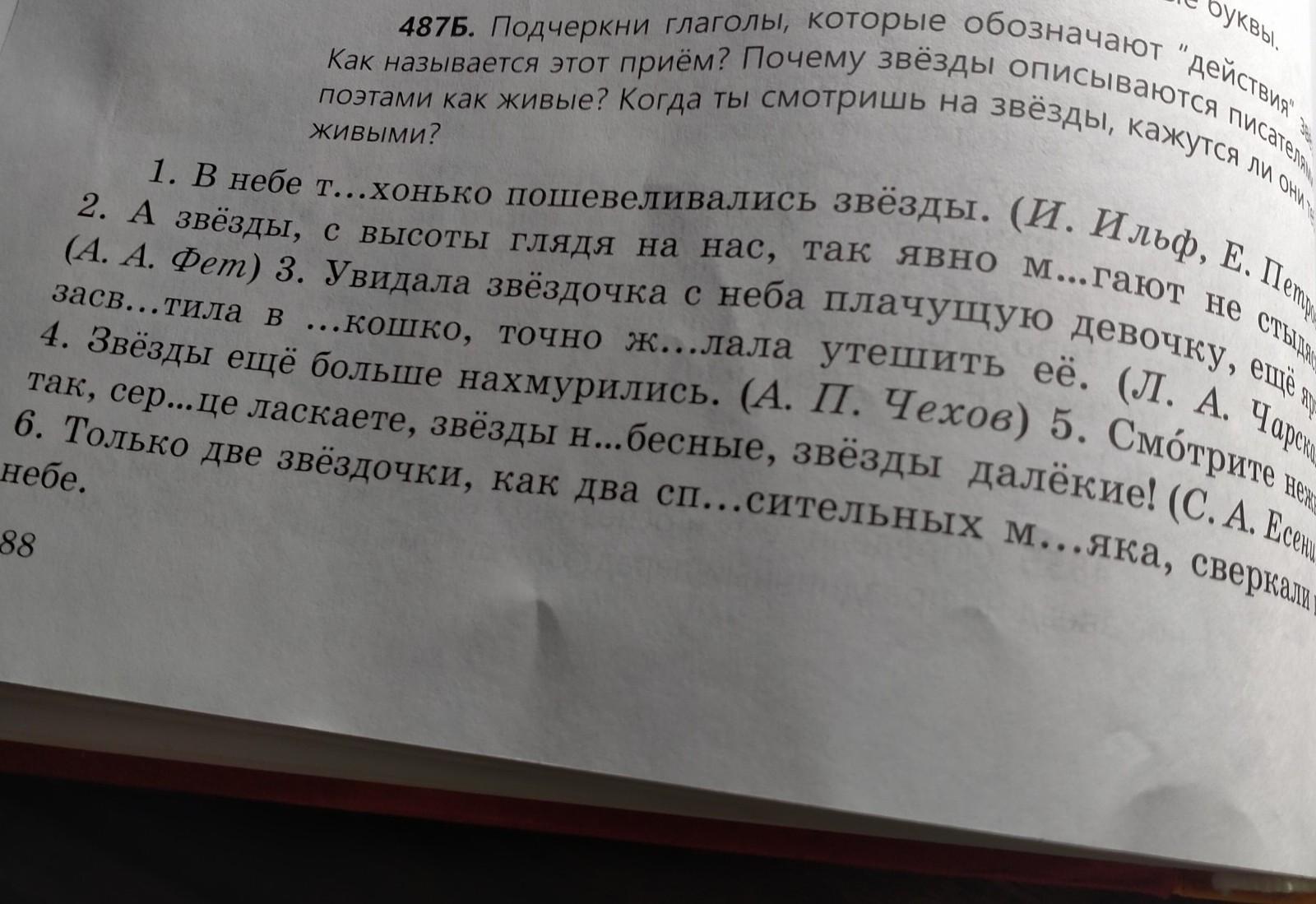 ( 487Б. Подчеркни глаголы, которые обозначают "дейсик поэтами как живые? Когда ты смотришь на Звезды, кажутся и Как называется этот прием? Почему Звезды огтисываются писать 1. В небе т...хонько пошевеливались звёзды. (И. Ильф, E. Це 2. А звёзды, с высоты глядя на нас, так явно м...гают не са (А. А. Фет) 3. Увидала звёздочка с неба плачущую девочку, есі засв...тила в ...кошко, точно ж...лала утешить ее, (М. А. Чо 4. Звёзды ещё больше нахмурились. (А. П. Чехов) 5. Смотрите так, сер...це ласкаете, звёзды н... бесные, звёзды далёкие! (С.А. Е. 6. Только две звездочки, как два сп...сительных м...яка, свету небе. 188