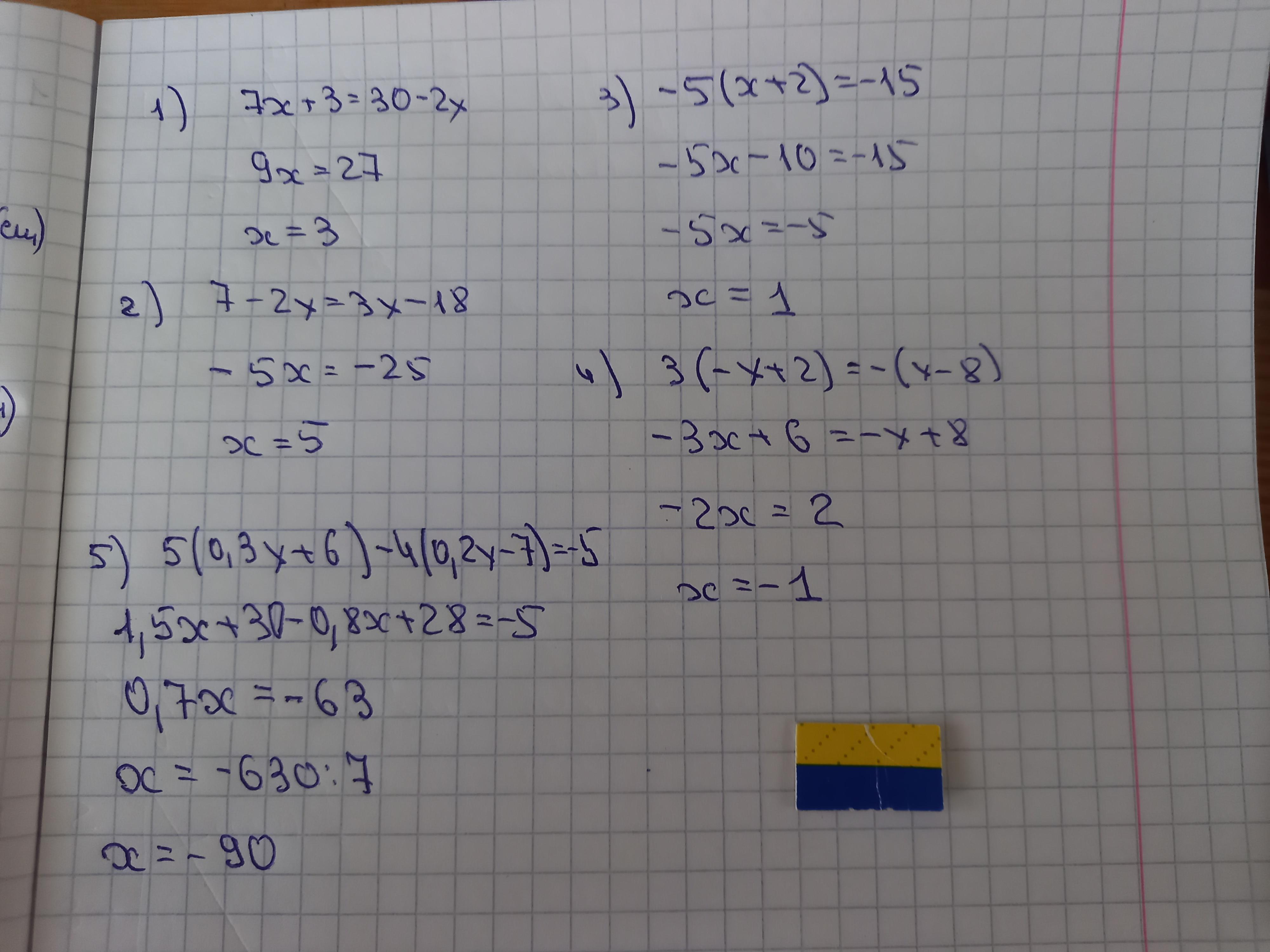 5) 5(0,3x+6)-4(0,2x-7)=-5;