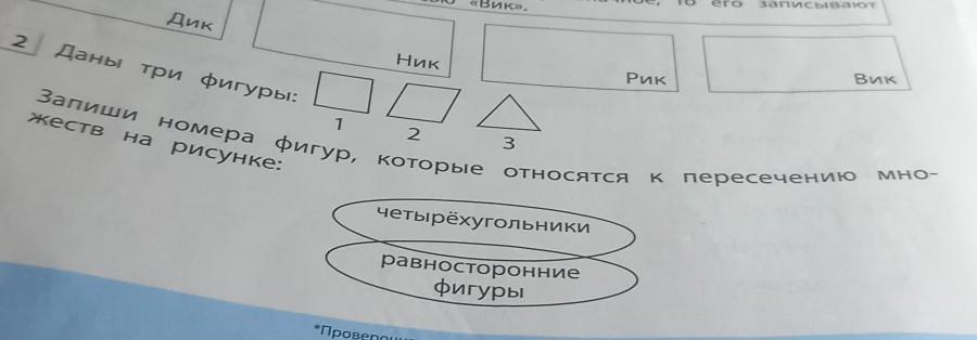2 Дано три фигуры. Запиши номера фигур, которые относятся к пересечению множеств на рисунке: четырёхугольники равносторонние фигуры