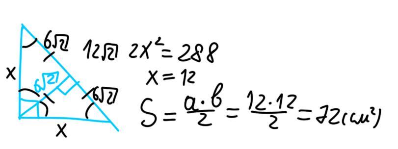 Найдите площадь равнобедренного треугольника,если высота опущенная из вершины прямого угла этого прямоугольного треугольника равна 6√2.