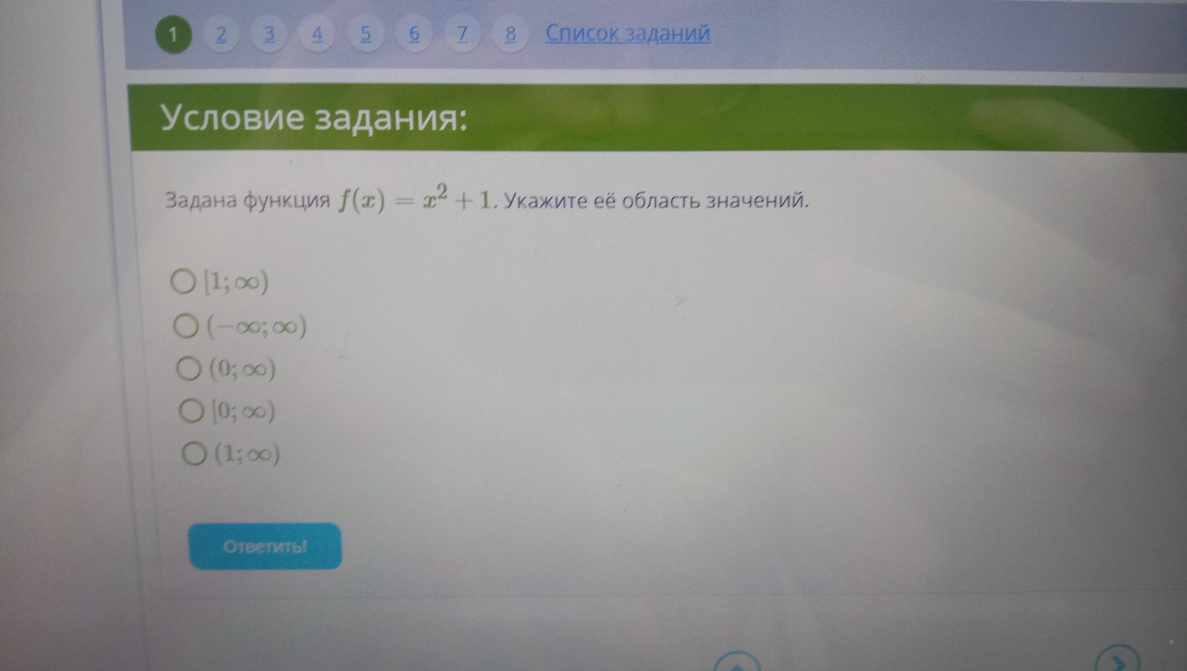 Задана функция f(x) = x2 (в квадрате) + 1. Укажите ее область значений.