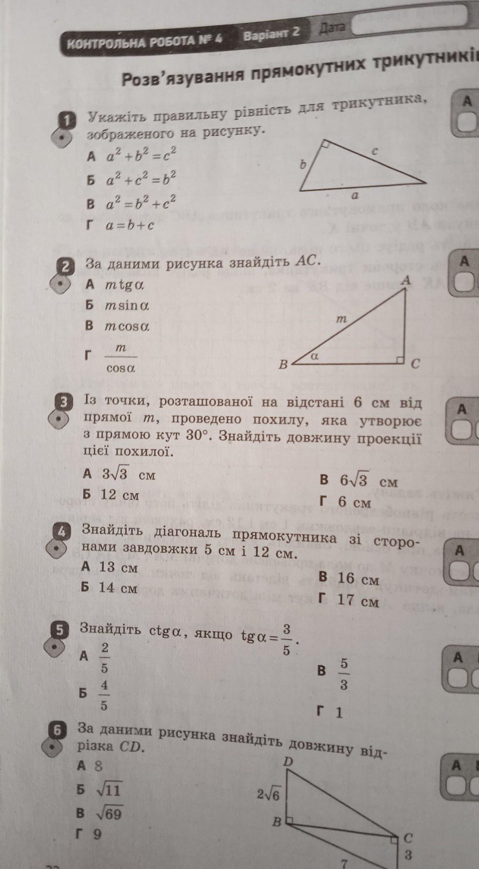 2 . Б . msinα . 6 . Із прямок. ΔАВС : ВС = √(7² - 3² ) =
