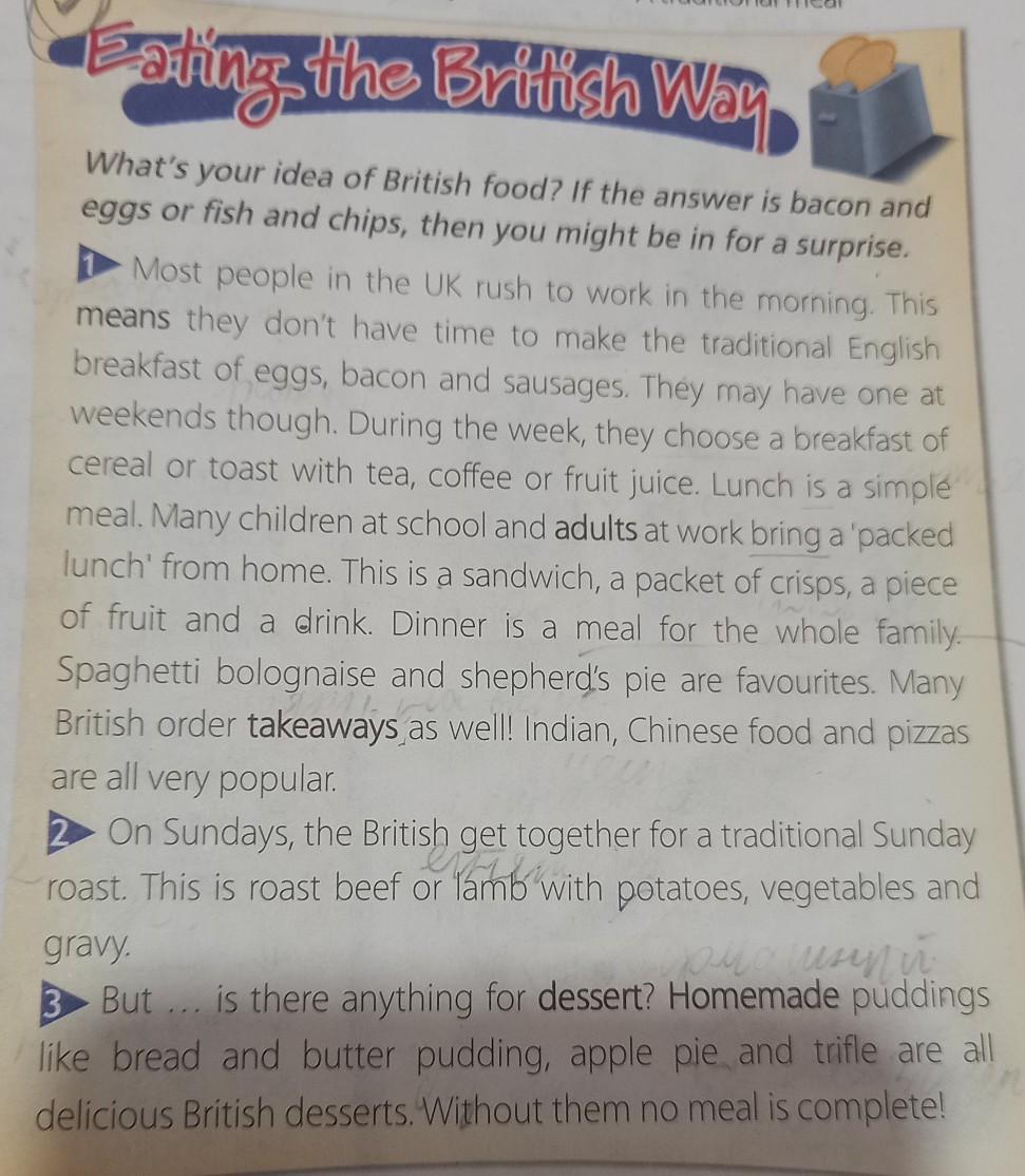 1. Мост пипл ин зе юкей раш ту ворк ин зе монинг. Зис минс зей донт хэв тайм ту мэйк зе традишонэл Инглиш брэкфаст оф эгз, бэкон энд сосиджэс. Зей мэй хэв уан эт уикендс зу. Дьюрин' зе уик, зей чуз э брэкфаст оф сирИэл о тоуст уиз ти, коффи о фрут джус. Ланч ис э симпл мил. Мэни чилдрэн эт скул энд эдАлтс эт ворк бринг э 'пэкид ланч' фром хоум. Зис ис э сэндвич, э пэкет оф криспс, э пис оф фрут энд э дринк. Диннэ ис э мил фо зе вол фэмили. Спэгетти болоньез энд шепхердз а фэворитс. Мэни Бритиш одэ тейквэйс эс велл Индиан, Чайниз фуд энд пиззас а ол вэри попьюлар.