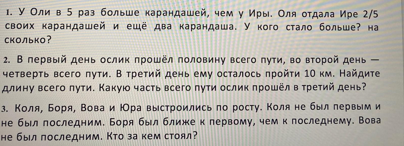 1. пусть у Иры х карандашей, тогда у Оли 5х, когда Оля отдаст 2/5 от 5х, т.е. (2/5)*5х=2х, и еще 2 карандаша, у нее останется 5х-2х-2=3х-2 карандаша, а у Иры станет х+2х+2=3х+2, станет больше у Иры, на 4 карандаша, т.к. (3х+2)-(3х-2)=3х+2+3х+2=4