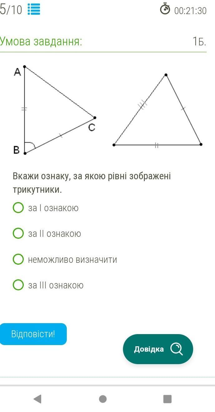 1 ознака. Якщо дві сторони і кут між ними одного трикутника відповідно дорівнюють двом сторонам і куту між ними іншого трикутника, то такі трикутники рівні.