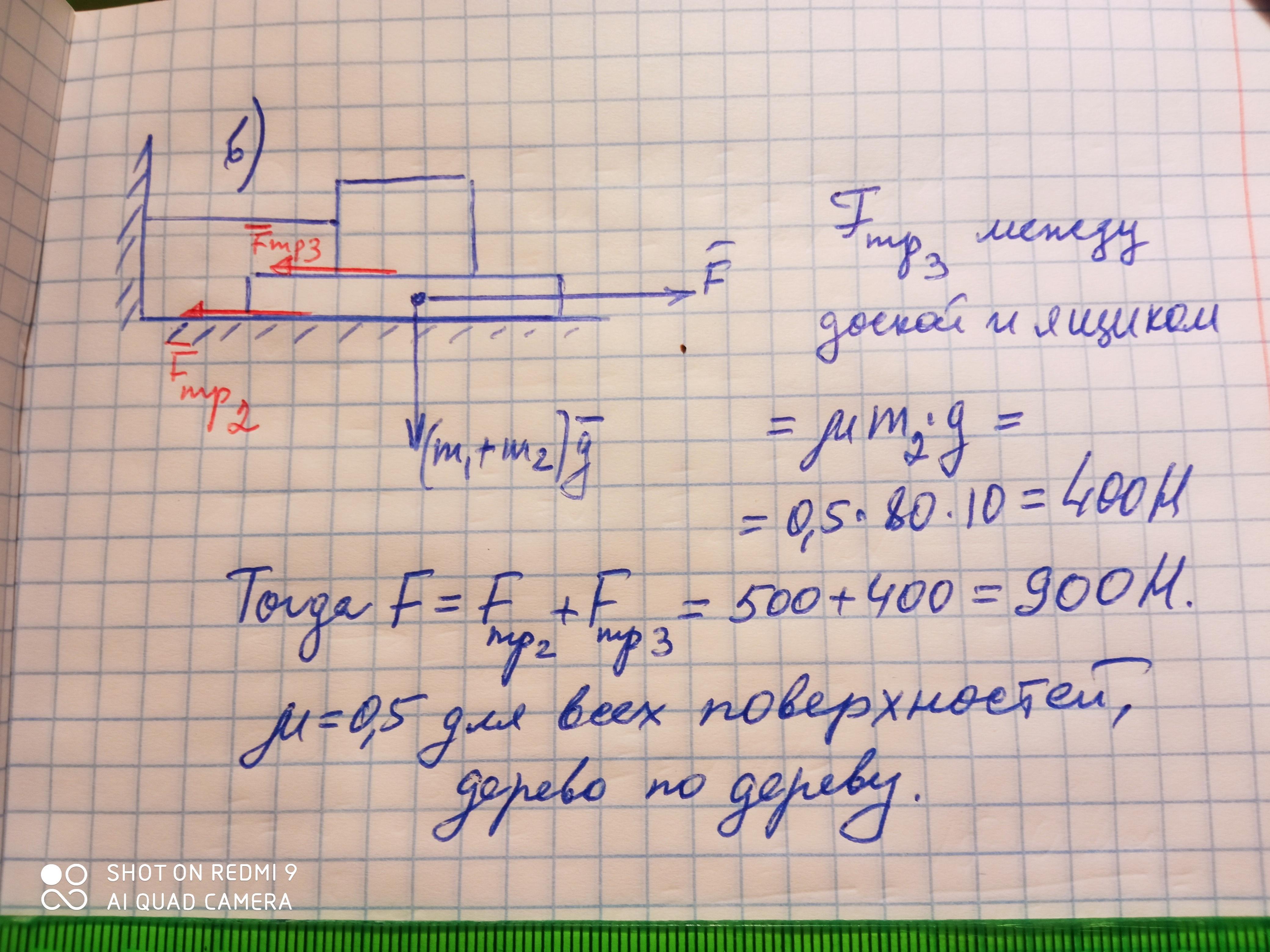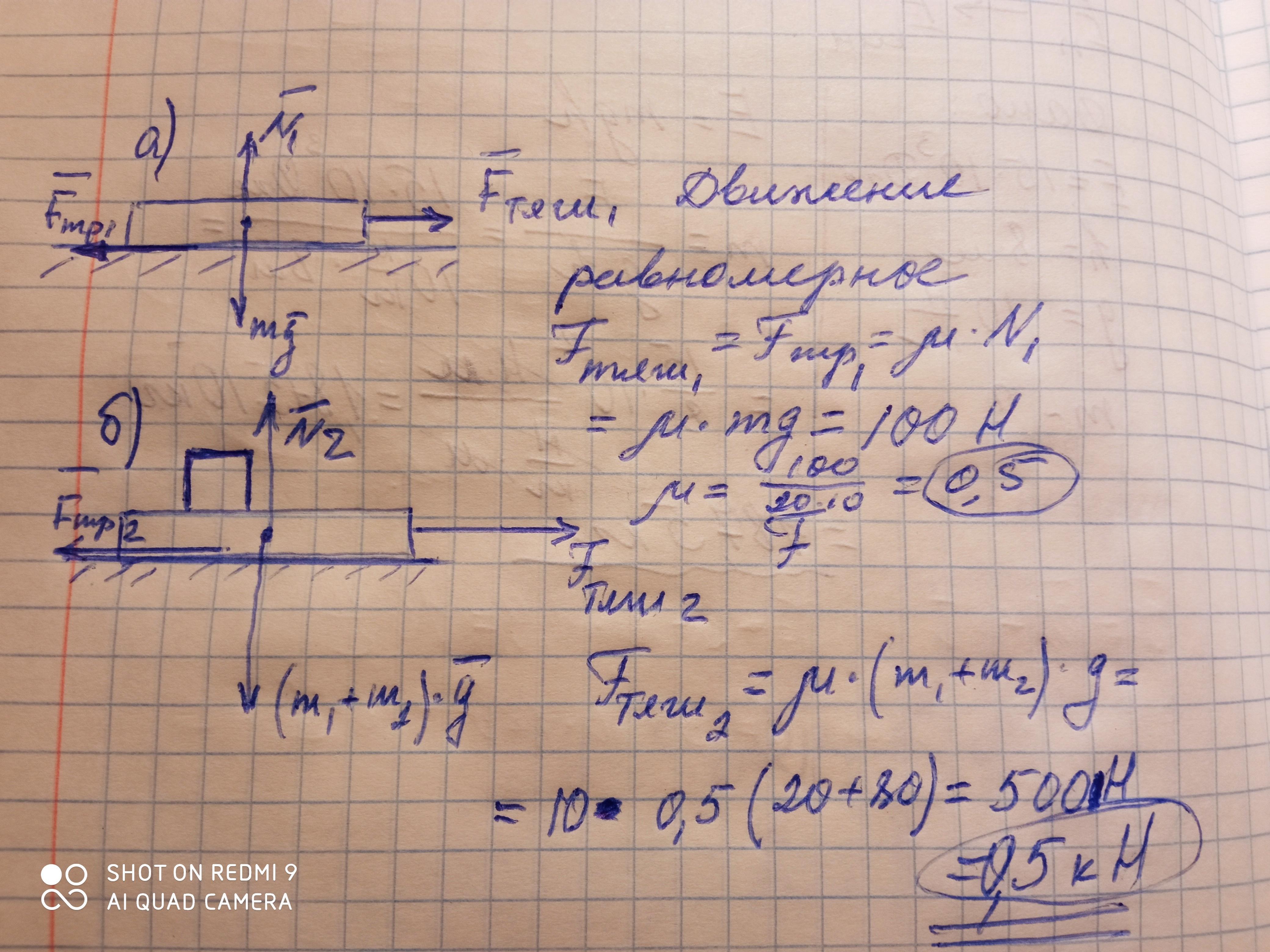 Чтобы доску массой 20 кг равномерно тащить по полу, нужно приложить силу 100 Н. На доску поставили деревянный ящик с грузом массой 80 кг. Определите: а) какую силу F, необходимо приложить к доске, чтобы равномерно перемещать ее с ящиком; б) какую силу F. нужно приложить к доске, чтобы вытащить ее из-под ящика, если он будет привязан к стене (рис. 7.2). (Учесть, что отношение силы трения к силе давления есть величина постоянная.)