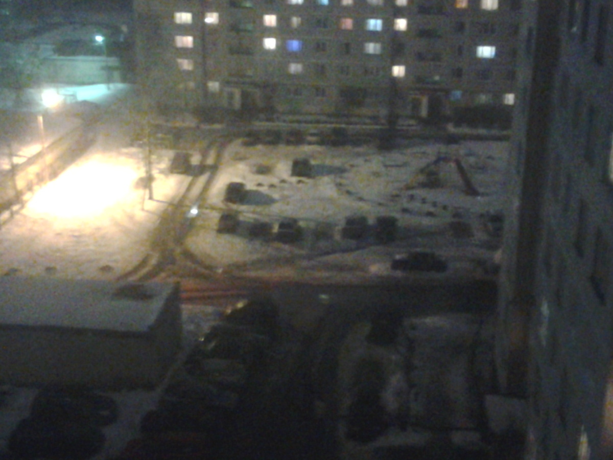 Вокруг вечером тихо, спокойно. На земле ровно расстилается белый ковёр из снега. Напротив стоит высотный дом, в котором ещё так активно продолжается день. Изредка по улице проходят люди, которые после трудового дня спешат домой. И еле-еле слышно, как хрустит снег.