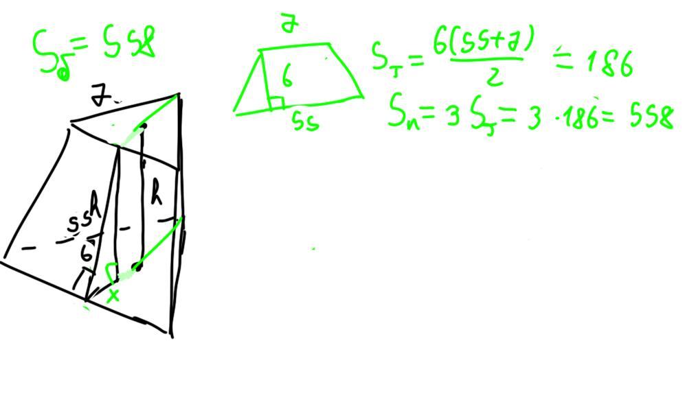 Найди площадь боковой поверхности правильной усечённой треугольной пирамиды, стороны оснований которой равны 55 и 7, а высота боковой грани — 6 .