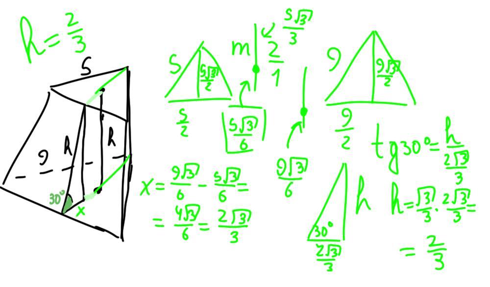 Боковое ребро правильной усечённой треугольной пирамиды наклонено к плоскости основания под углом 30° . Найди высоту пирамиды, если стороны оснований пирамиды равны 5 и 9.