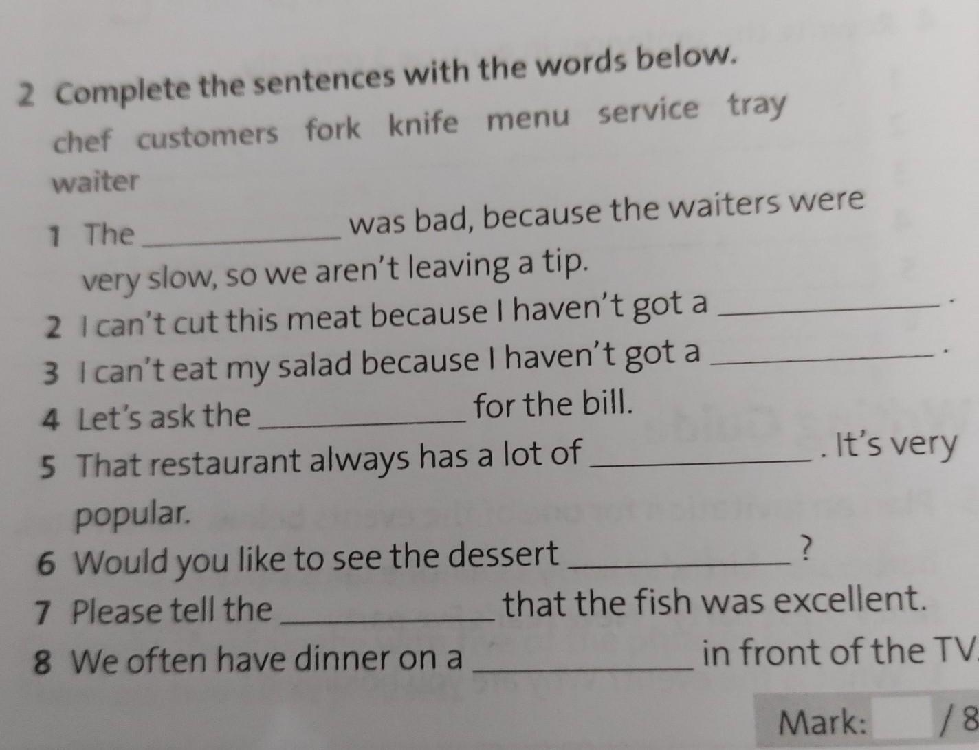 1) service 2) knife 3)fork 4)waiter 5)customers 6)menu 7)chef 8) tray